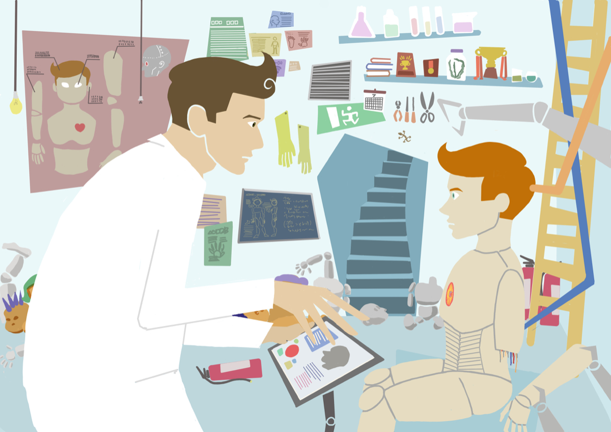 大人と子ども、その2人の関係性を描くという課題で、サイボーグの少年と博士を描きました。