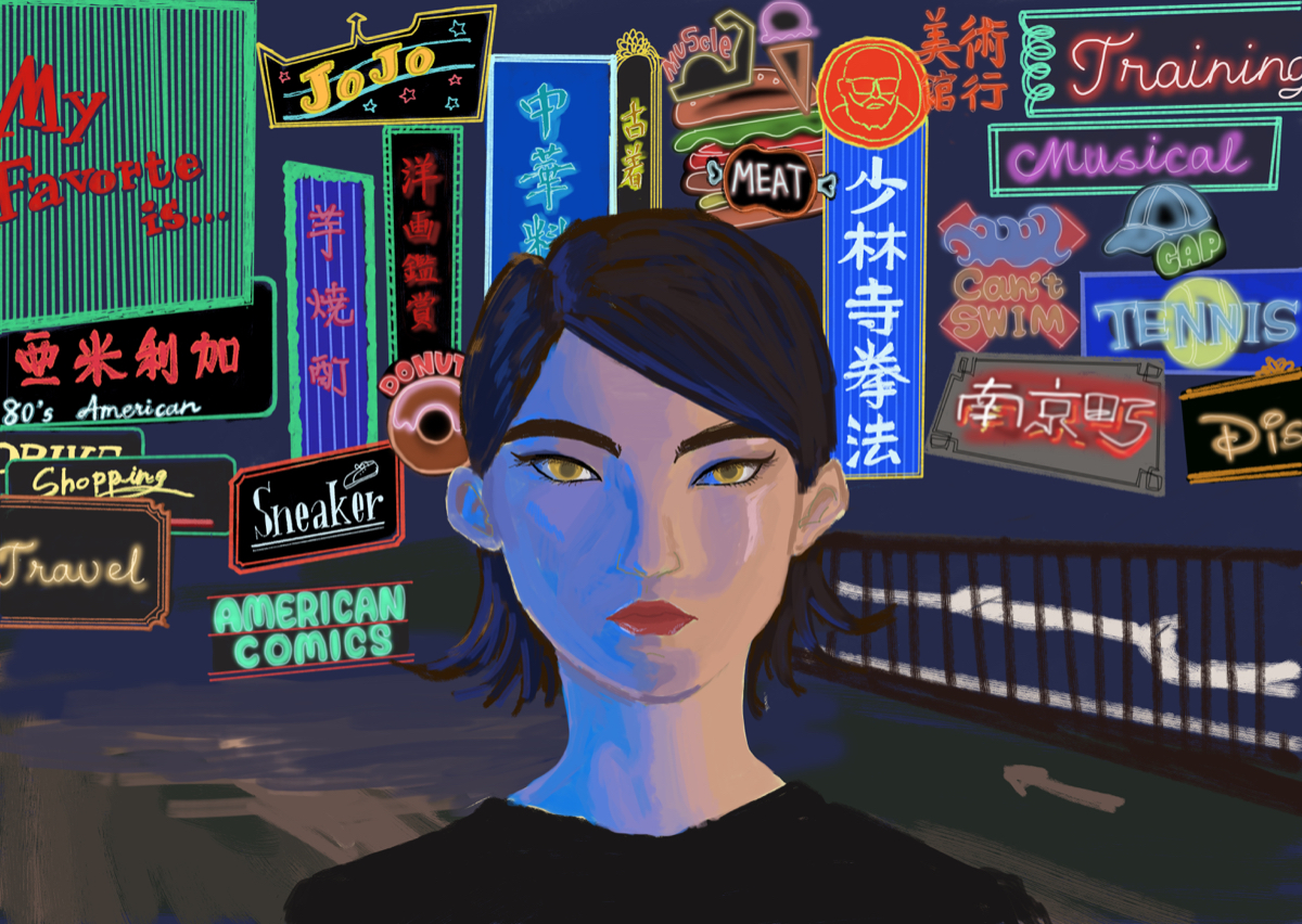 自分を表現するという課題で、香港のネオン街をテーマに看板の中に私の好きなものや趣味を詰め込みました。