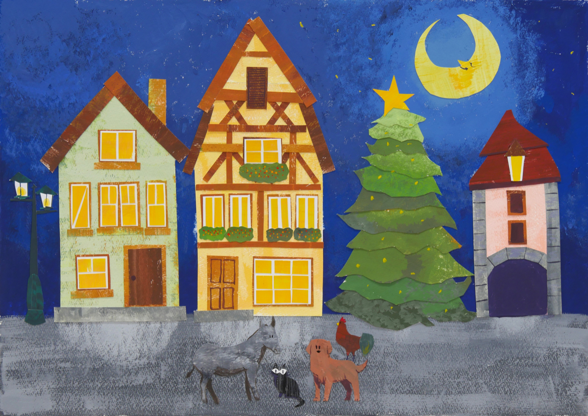 色々な素材の紙に様々な技法で色を塗り、それらを切って貼り付けることでアナログらしい絵本のような温かみのある一枚を完成させました。