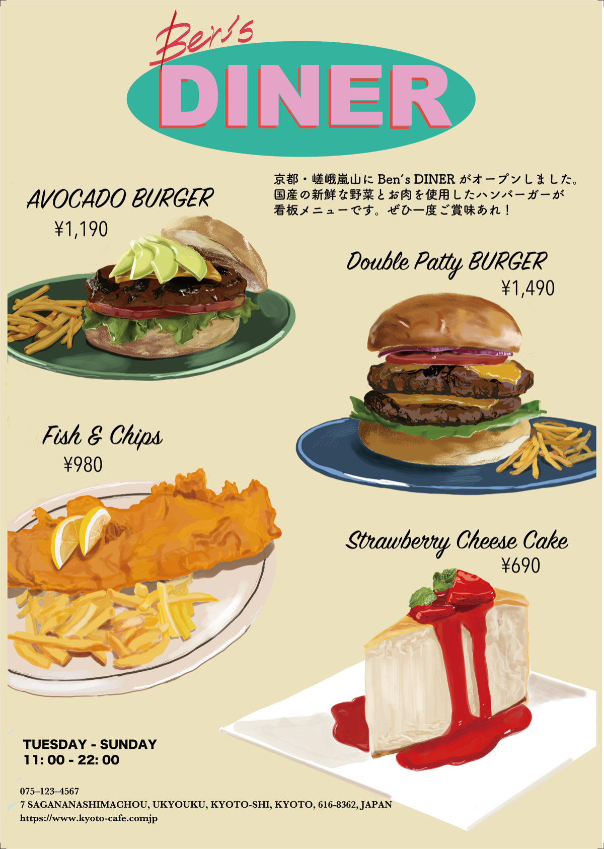 お店のコンセプトや料理も各自の自由でカフェのメニューを作るという課題で、アメリカのダイナーをイメージして制作しました。