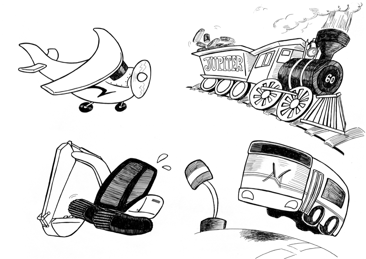 機関車など乗り物の参考資料が与えられ、それを元にデフォルメ化をしました。
