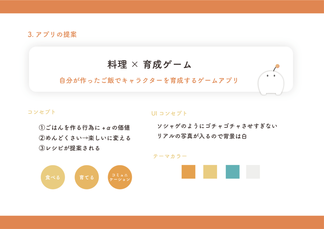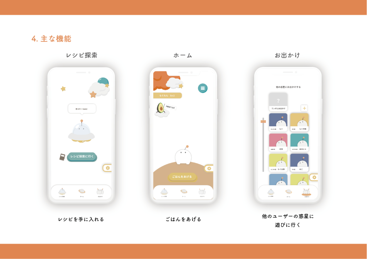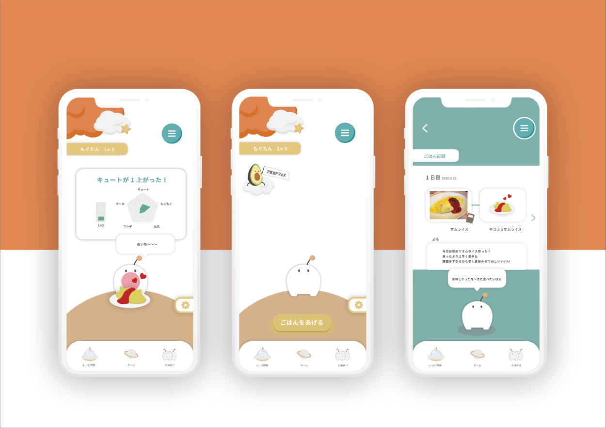 自分が作った料理を画像認識で読み取ることで、ゲーム内のキャラクターにごはんをあげることができ成長していく育成ゲームアプリ