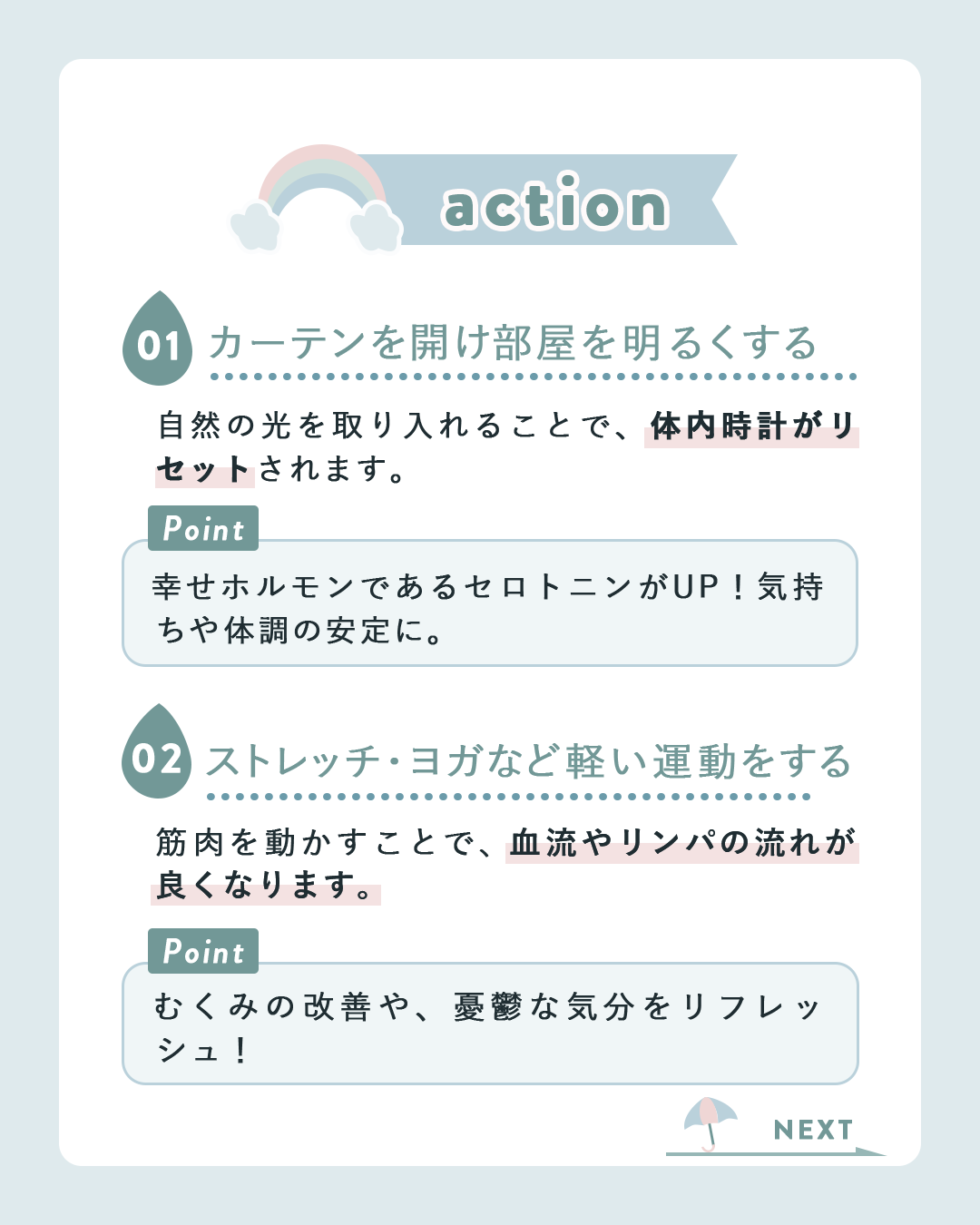 ・5枚目のクロージングとして、8つの習慣をリストにして優しく背中を押す一言を添え、保存を促す