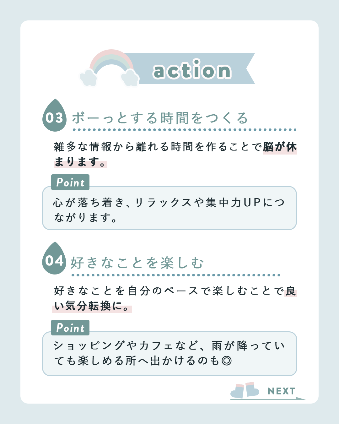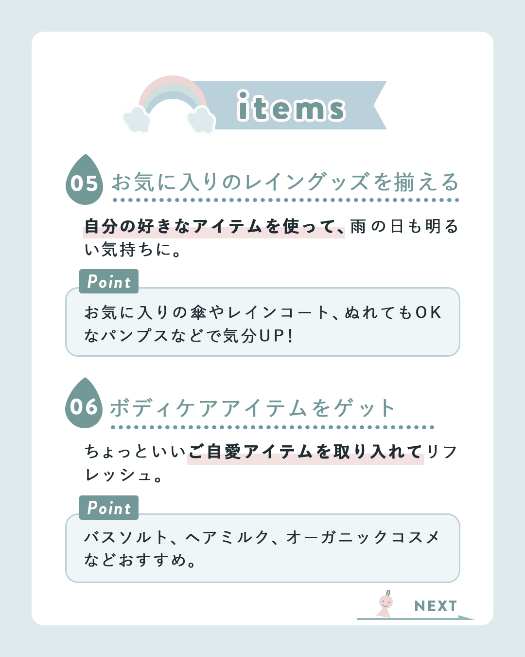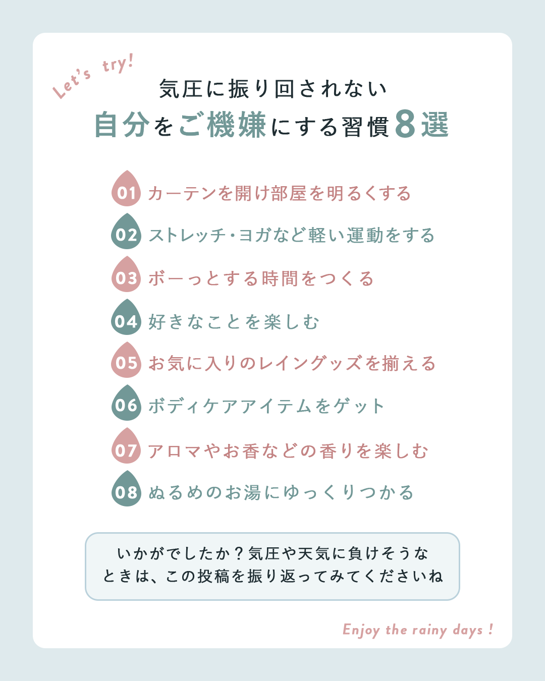 ・梅雨時期で体調が揺らぎやすい時期でも、閲覧者がこの投稿を見て前向きな気持ちで過ごせるような内容やデザインを制作しました。