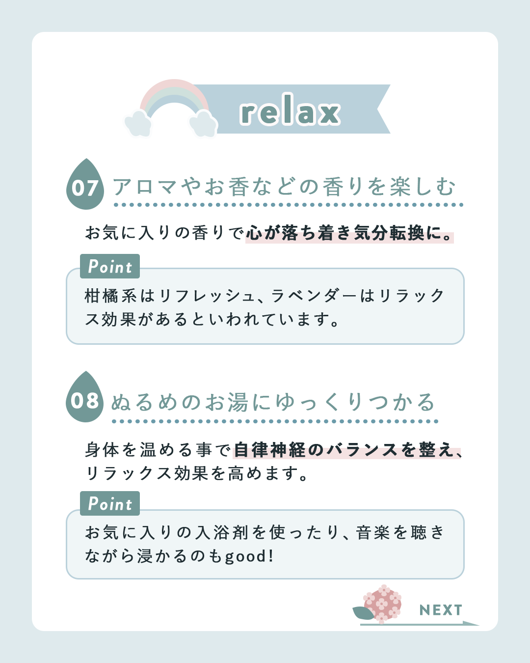 →閲覧者が最後まで読み進めやすい様、下部に「NEXT」の文字と矢印、季節に合ったイラストを添える