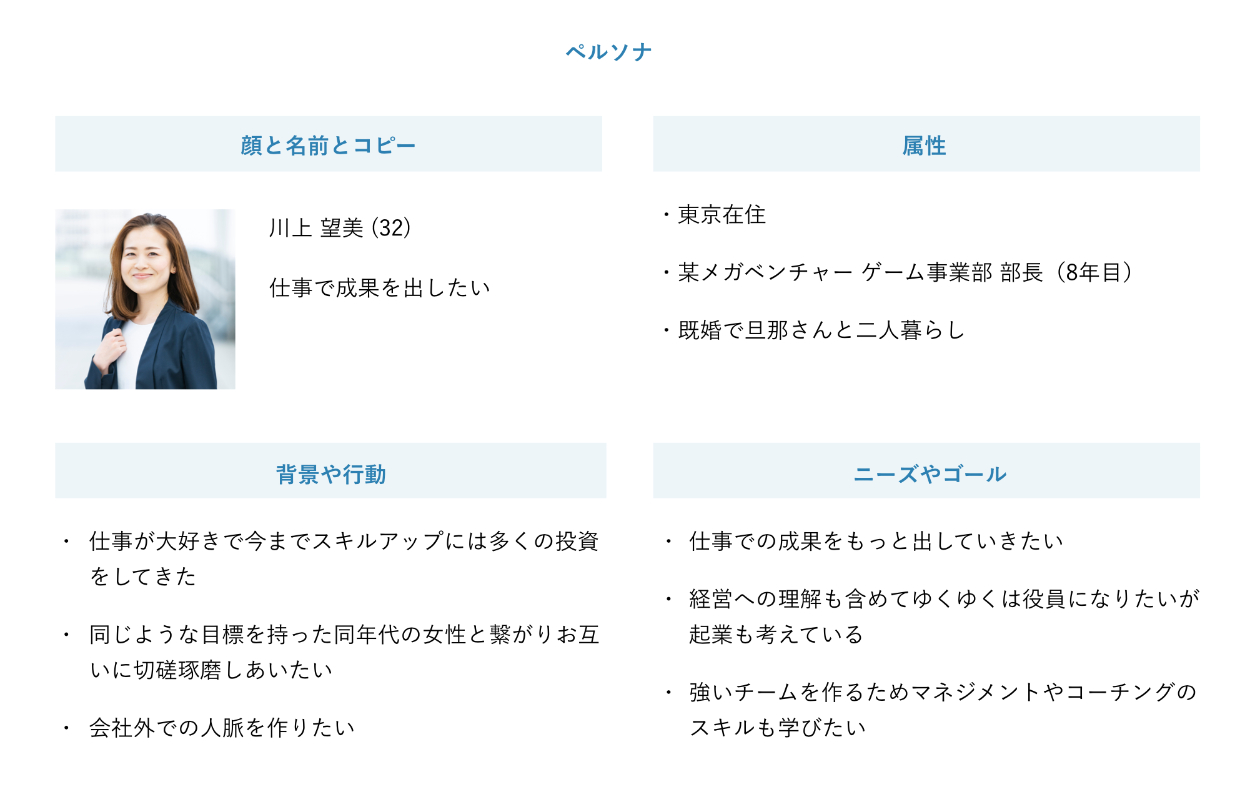 女性向けのビジネススクールを展開している。会員は20~30代の女性が多く、キャリアアップのためにビ ジネススキルを学び、さらにそのアウトプットの場として定期的にビジネスコンテストなどのイベントも 開催されている。