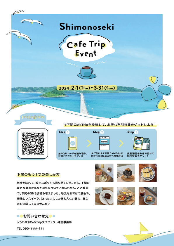 【架空のイベント】Shimonoseki Cafe Trip event (カフェと連携した特典を作り、SNS投稿と公式アカウントフォローを促す。若者の観光客を増やし、下関市を盛り上げようというイベント)