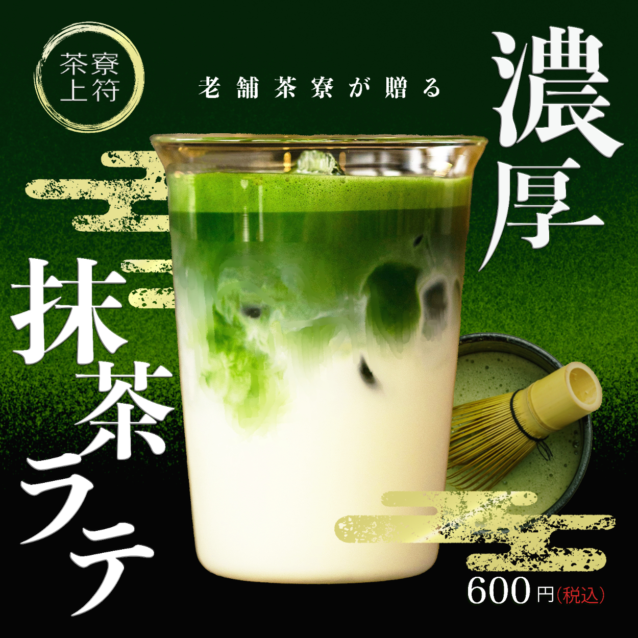 色は深緑と金色をメインに使用し、抹茶ラテの質感と高級感を意識しました。画像の抹茶ラテにブラシを使い、抹茶とミルクが溶け出しているように見せ、シズル感を表現しました。「濃厚」の文字はIllustratorで変形させ、ベベル・エンボス加工で重厚感を演出しました。