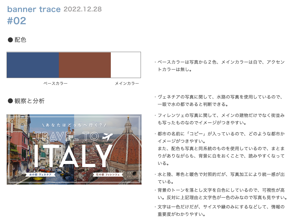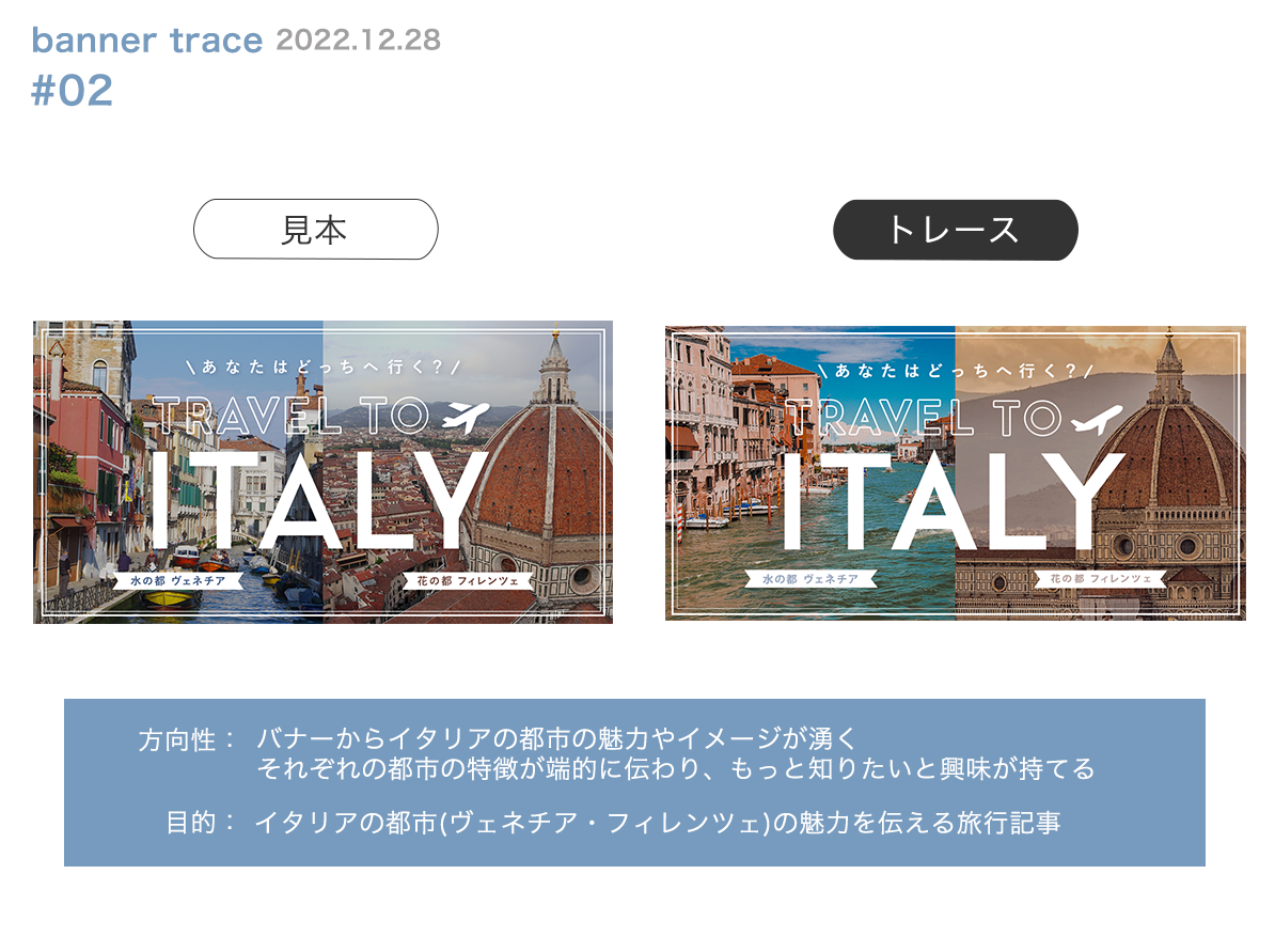 2度目のバナートレース。 イタリアの二都市の魅力を伝える記事ページへの誘導バナー。
