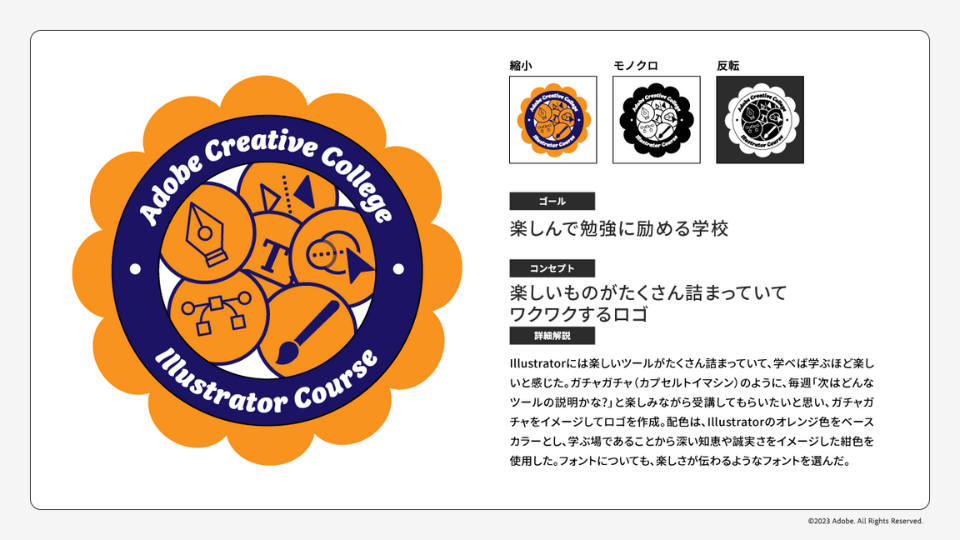 Illustratorのロゴにはオレンジ色が使用されていることからロゴにもオレンジ色を採用しました。また学ぶ場所であることから誠実さを連想させるネイビー色を採用しました。