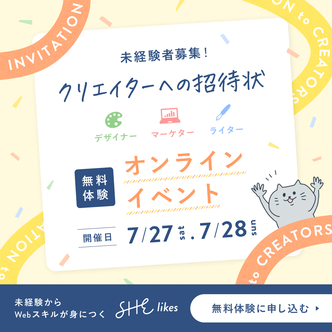 SHE株式会社様が運営する女性向けキャリアスクール「SHElikes」体験レッスンへの誘導を目的としたSNS広告バナーを制作しました。 使用ツール:Figma/制作時期:2024年7月