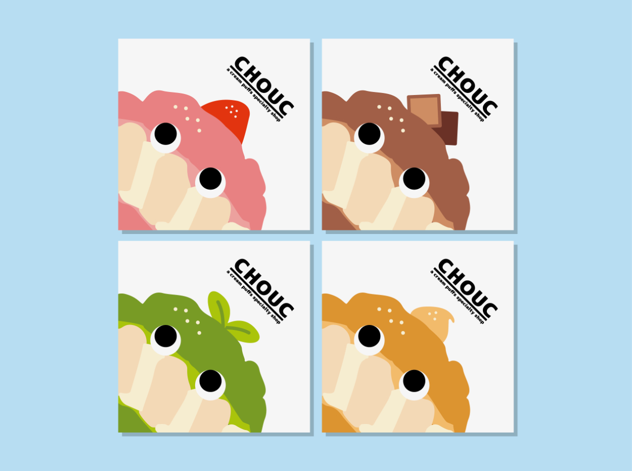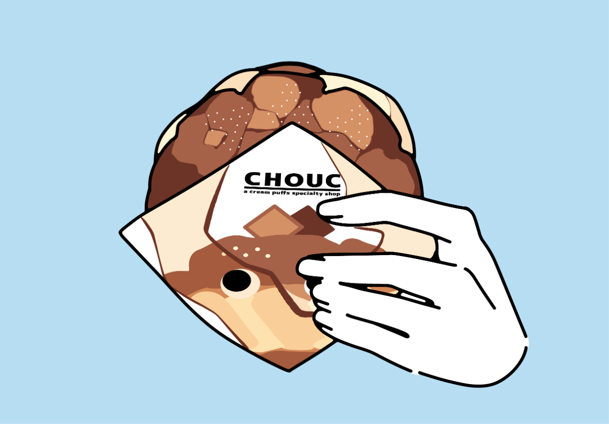 テイクアウト用のシュークリームの包装紙にイラストを大きく配置することで、食べている人とすれ違った人に興味を持ってもらうこと、またSNSに自撮りをあげるときに一緒に撮ってもらうことでの広告としての効果も期待しています。