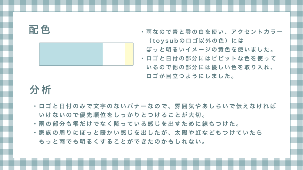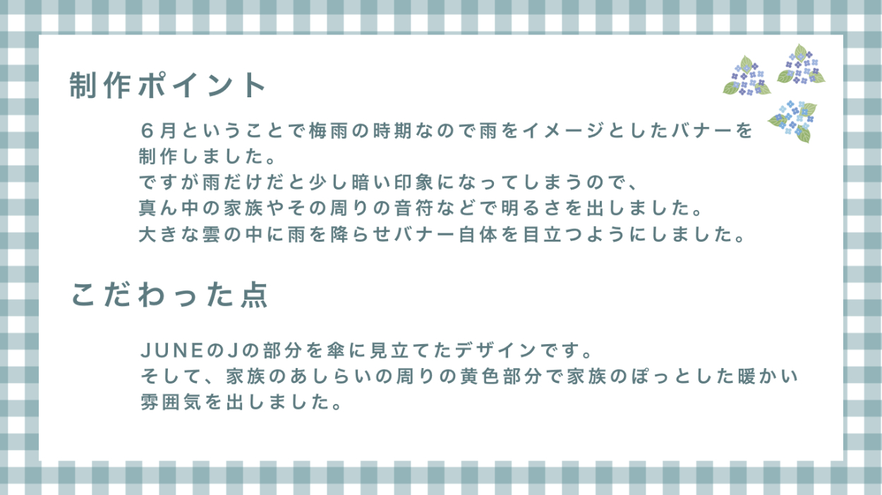 そして、優先順位をもっと意識して作っていかなければなと感じました。お客様の思いをバナーに出すことが大切なので次からはしっかりと最初から意識して制作していきたいです。