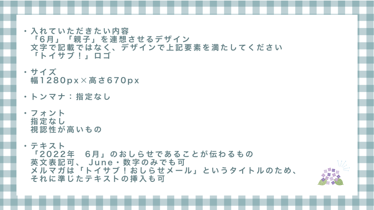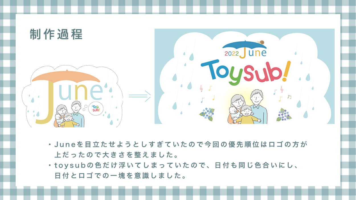 おもちゃ・知育玩具を、定期的にお届け・交換する定額制レンタルサービス「トイサブ!」を提供しているトラーナ様のお知らせメール6月分のバナー制作