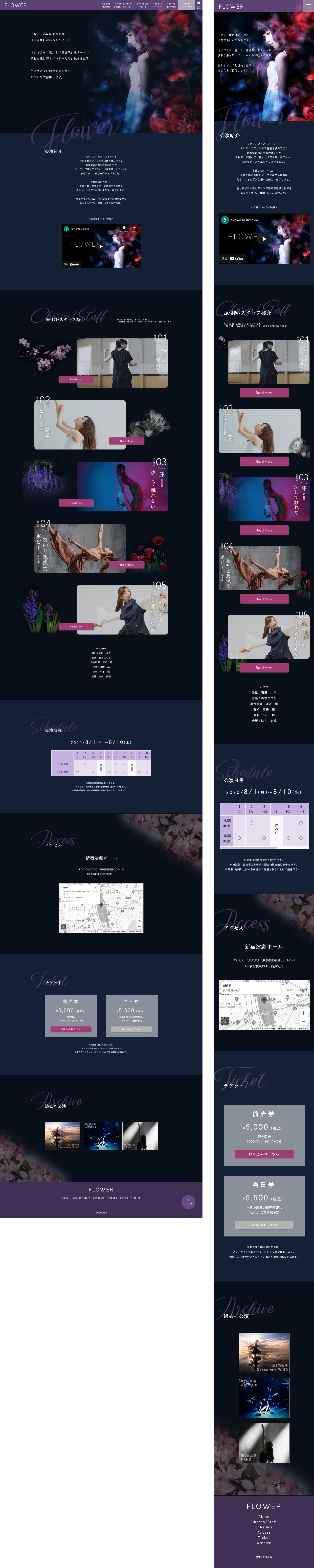 WEB制作スクールの卒業制作で、架空ダンス公演の紹介、チケット販売用サイトの制作を行いました。ページ内容の企画、設計、デザイン、コーディングまでを一貫して実施し、レスポンシブ表示にも対応しています。 制作時期:2020年7〜8月(約1ヶ月)