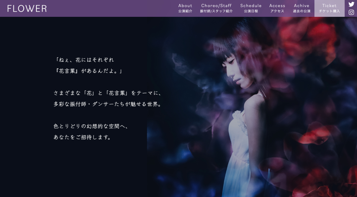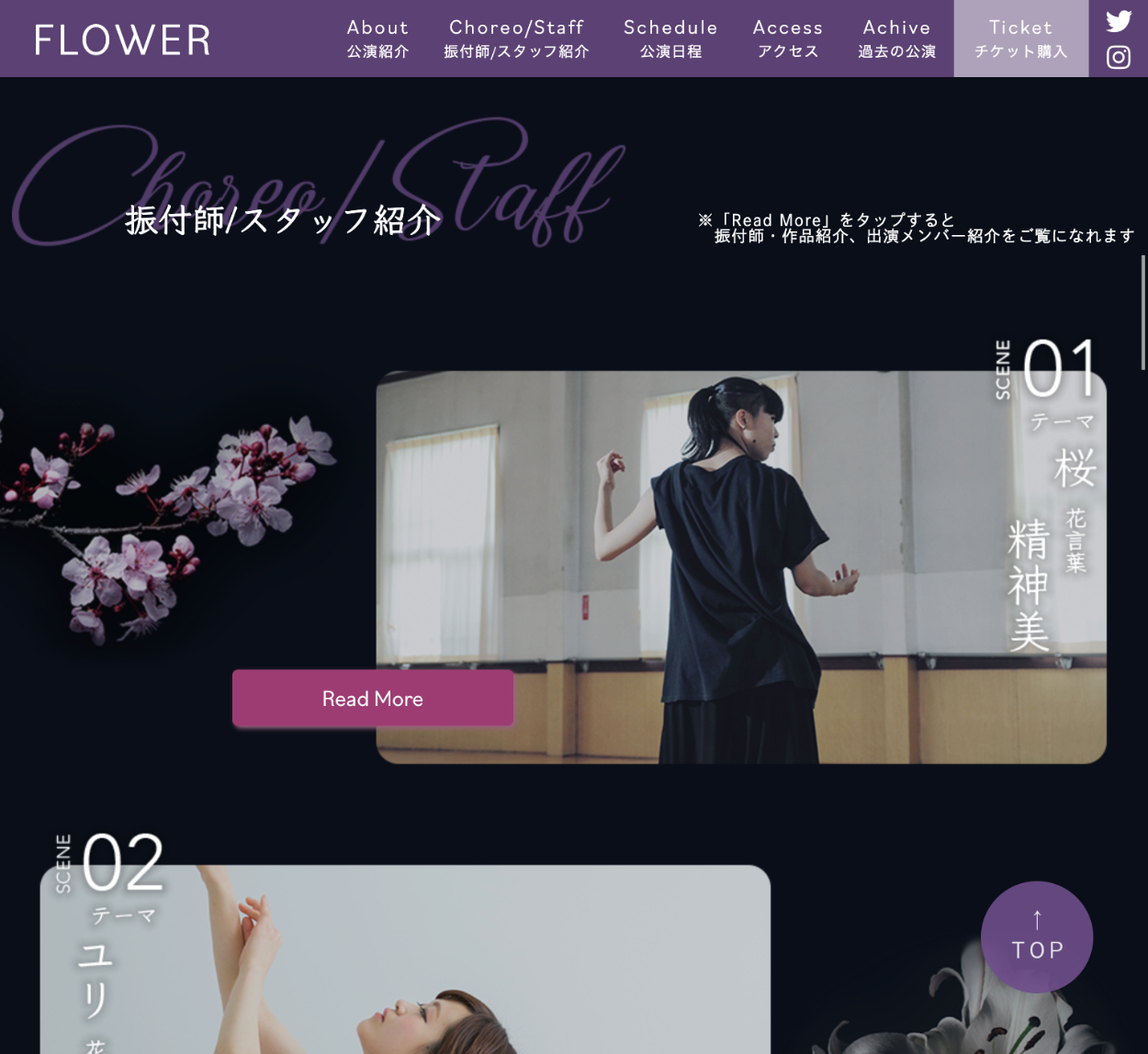 ダンス公演を見たことない人でも飽きずに迷わず見ることができるサイトを目指し、日本語表記を併記した固定ヘッダーや、ぱっと見でわかるチケット購入ボタンなどのユーザービリティを考慮しました。
