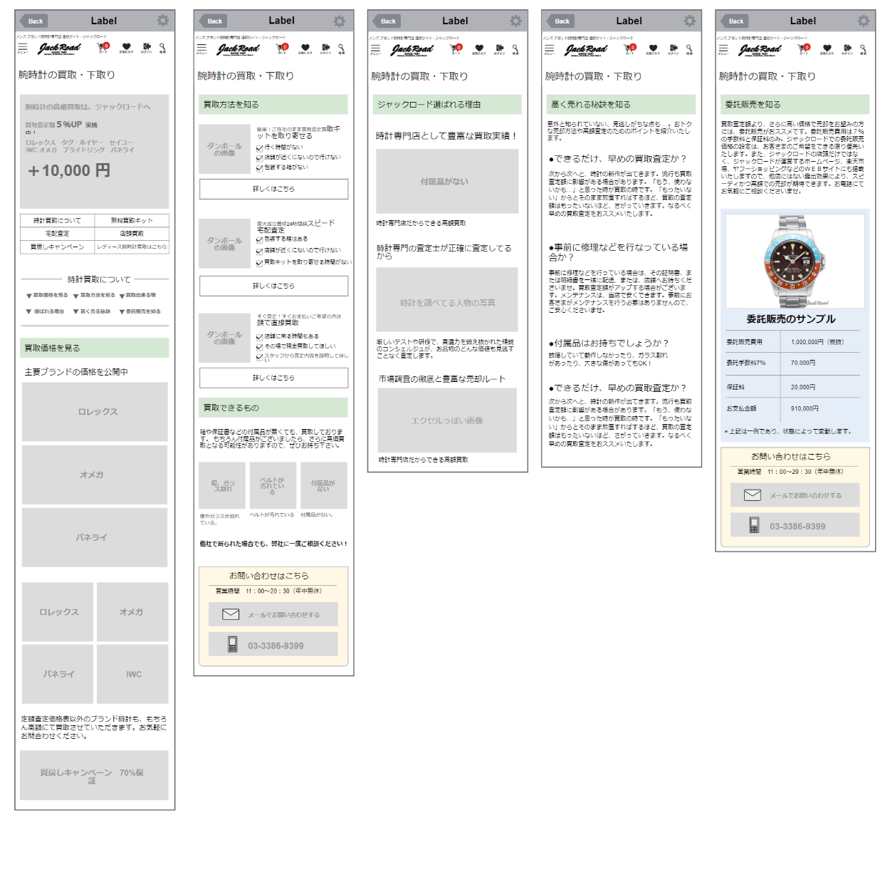 自分が行ったことは、Search Consoleを使用して買取トップページがどのキーワードで高い順位を上げてるかを確認し、そのキーワードで上位にいる競合サイトの買取ページをチェック。他社の事例なども参考にし、情報が乏しかった買取トップページに情報を追加してみることにしました。ワイヤーフレームを作成。
