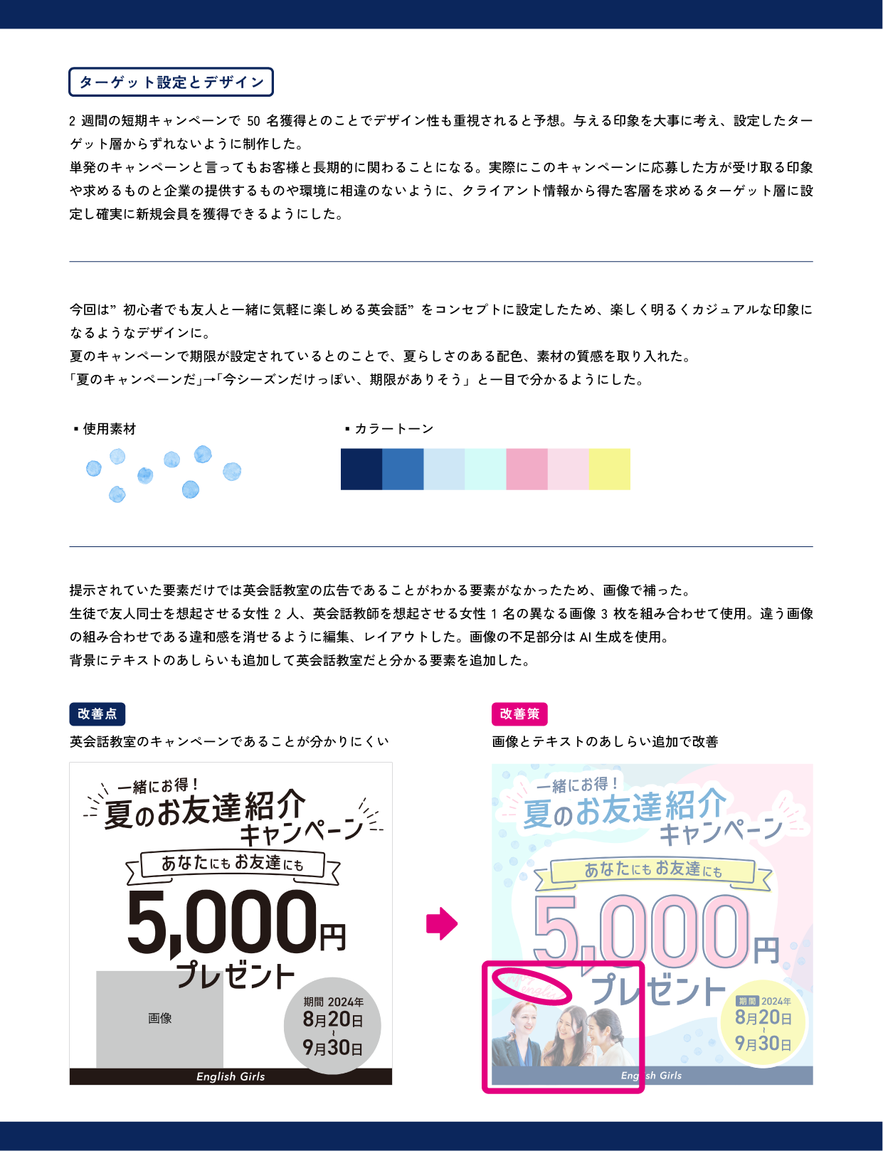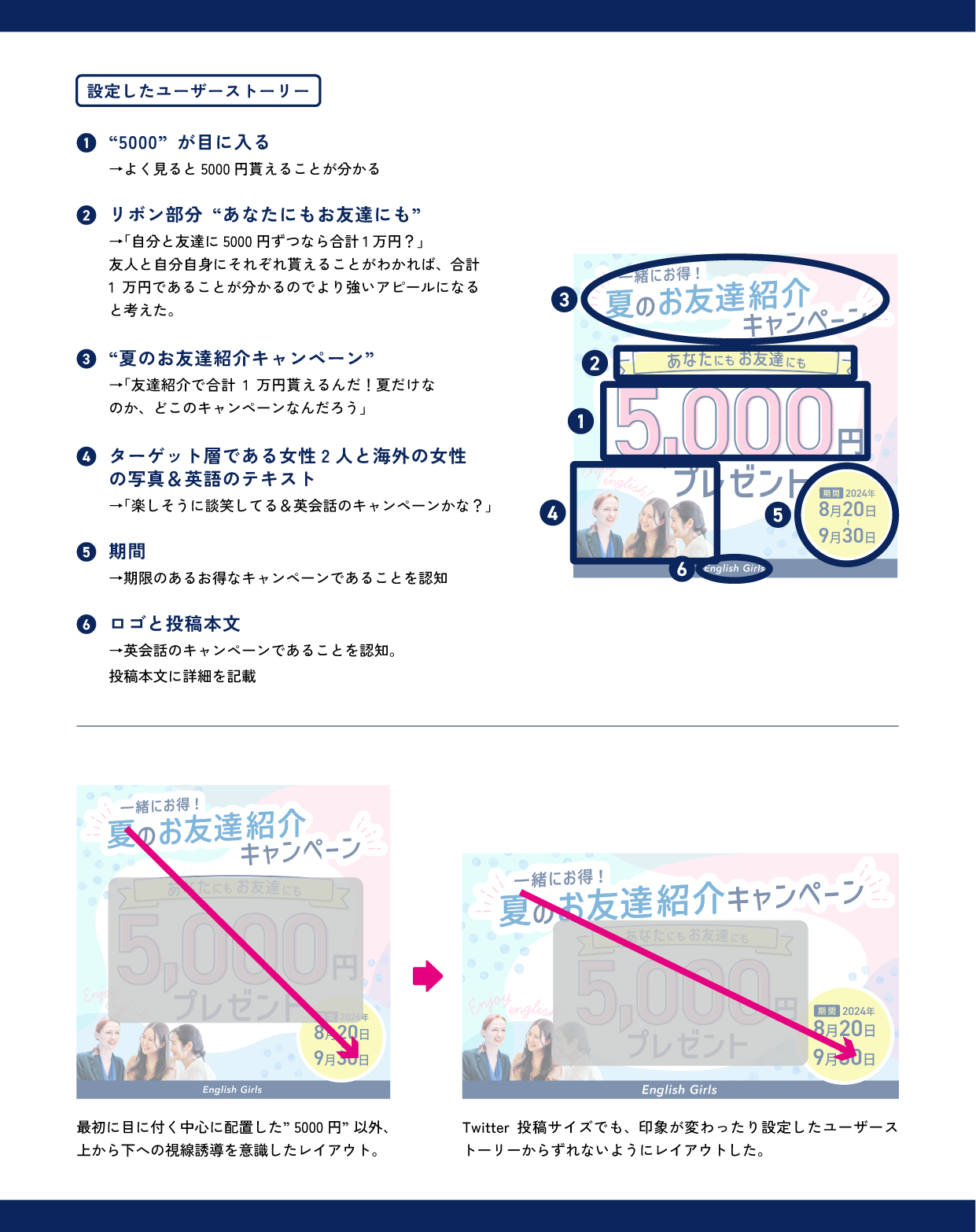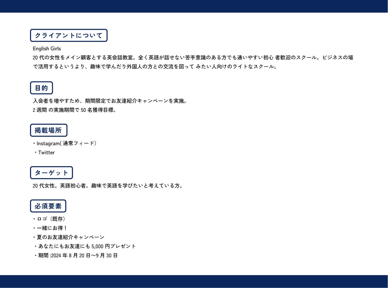 SNSバナー制作 松原 莉香 フリーター OVERVIEW 英会話教室「English Girls」からの依頼を想定したバナー。 オンラインスクールの課題。事前に提示されていた要件からバナーを制作しました。完成データ▪︎Instagram▪︎Twitterターゲット設定とデザイン要件要件から想定したユーザーストーリー