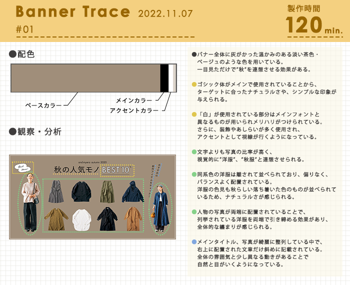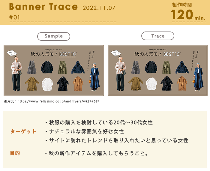 バナーをただトレースするのではなく、このバナーは誰をターゲットとしているのか、このバナーで何を伝えたいのか、など目的を明確にしてからトレースに取り組みました。目的を明確にし、常に意識することで、配置の理由付けやフォント選びの根拠などを言語化しながら分析することができました。
