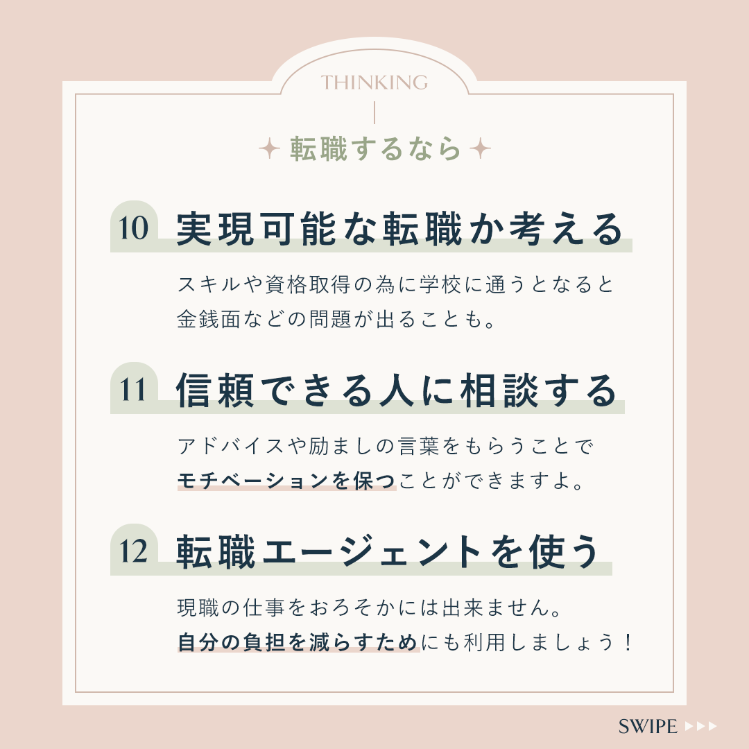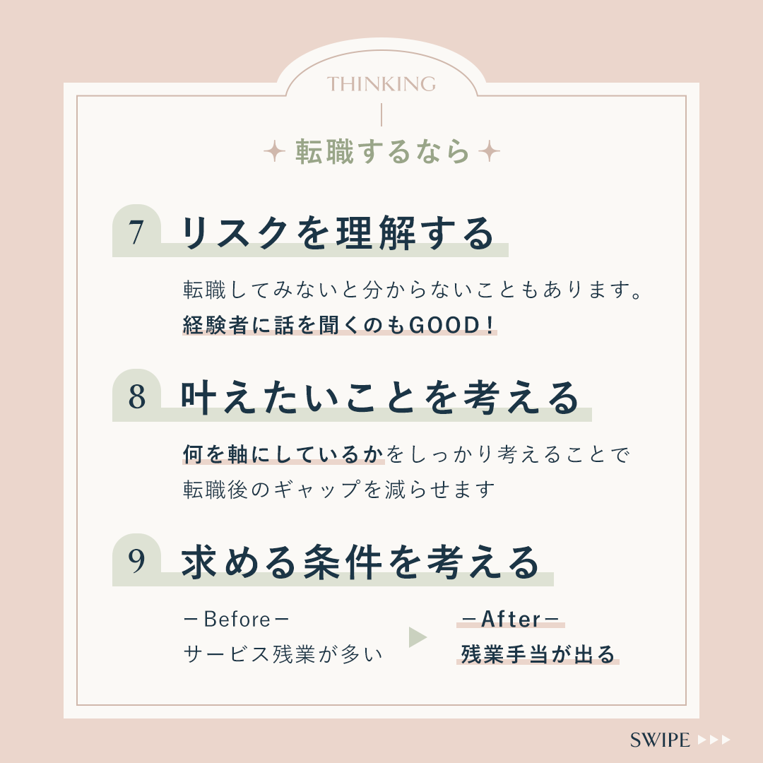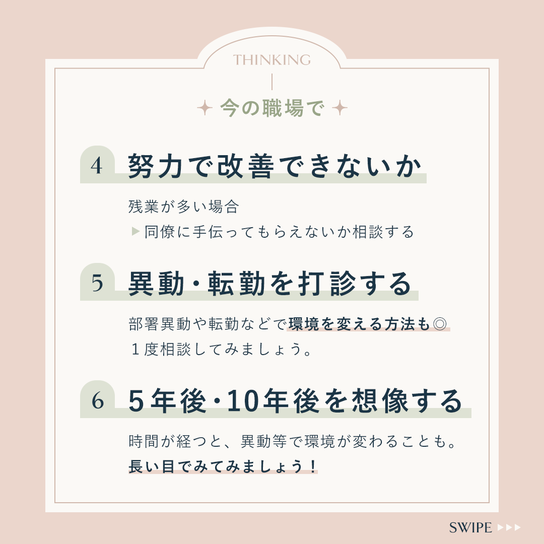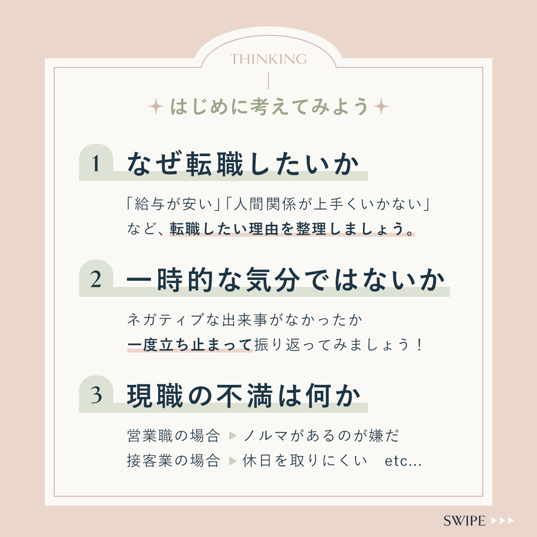⋄自己分析ができるように、「立ち止まって考える」→「現状把握」→「転職する場合」の順で並べました。