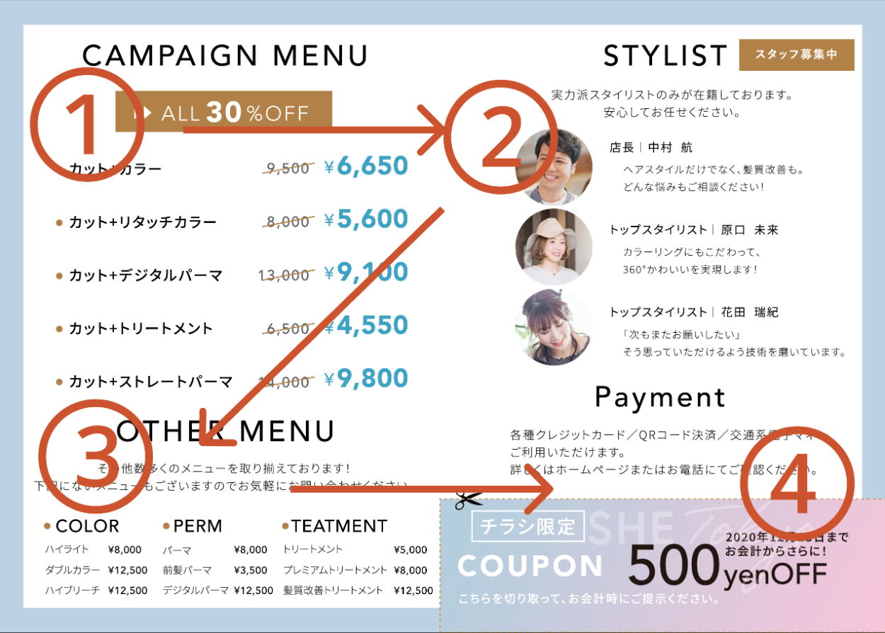 キャンペーン情報→スタイリスト情報→その他メニューや支払い情報→チラシ限定クーポンという流れ。
