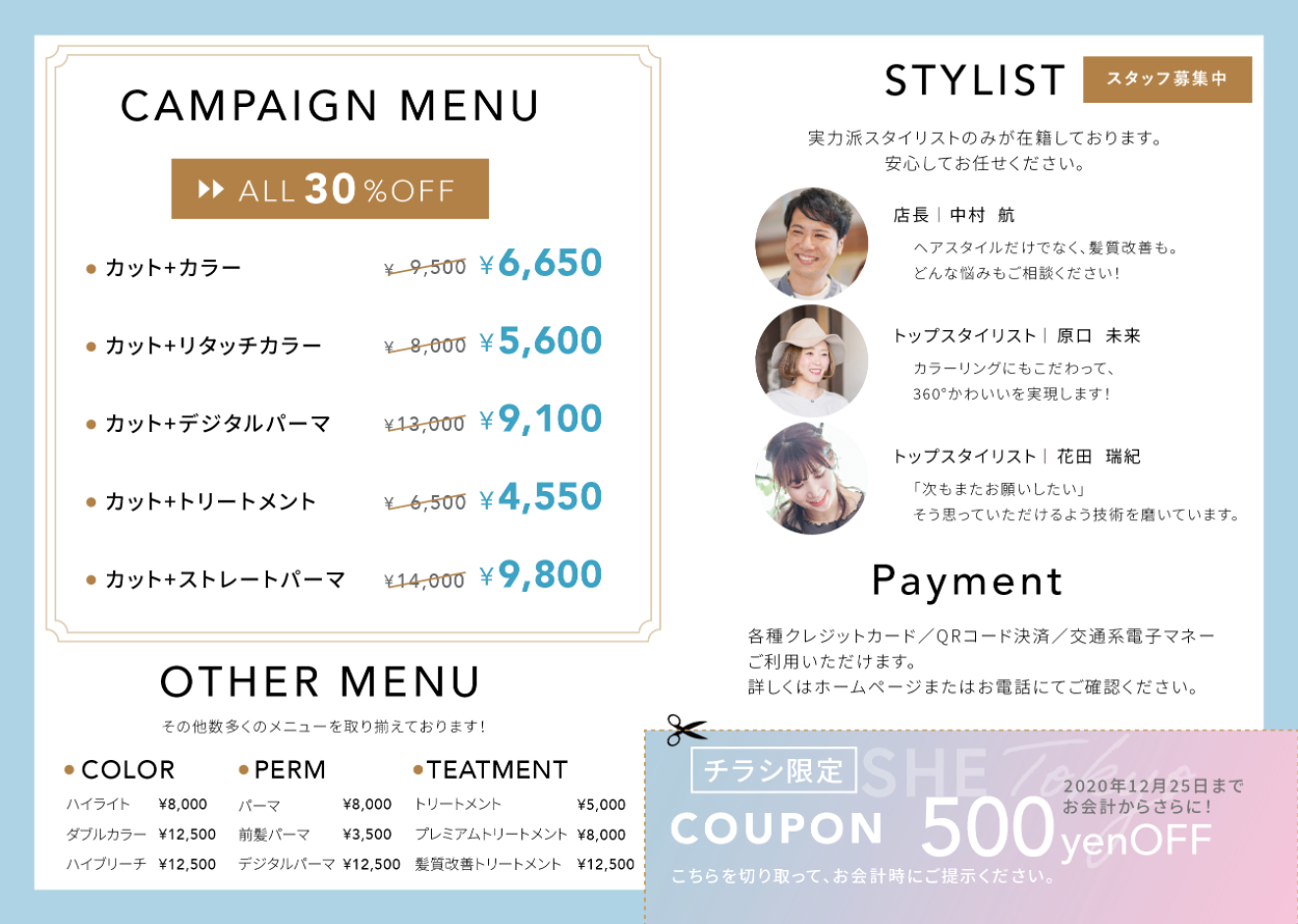 ■ご依頼:美容室オープンに伴い、特別キャンペーンを実施するため、ポスティング用のフライヤーを制作してほしい