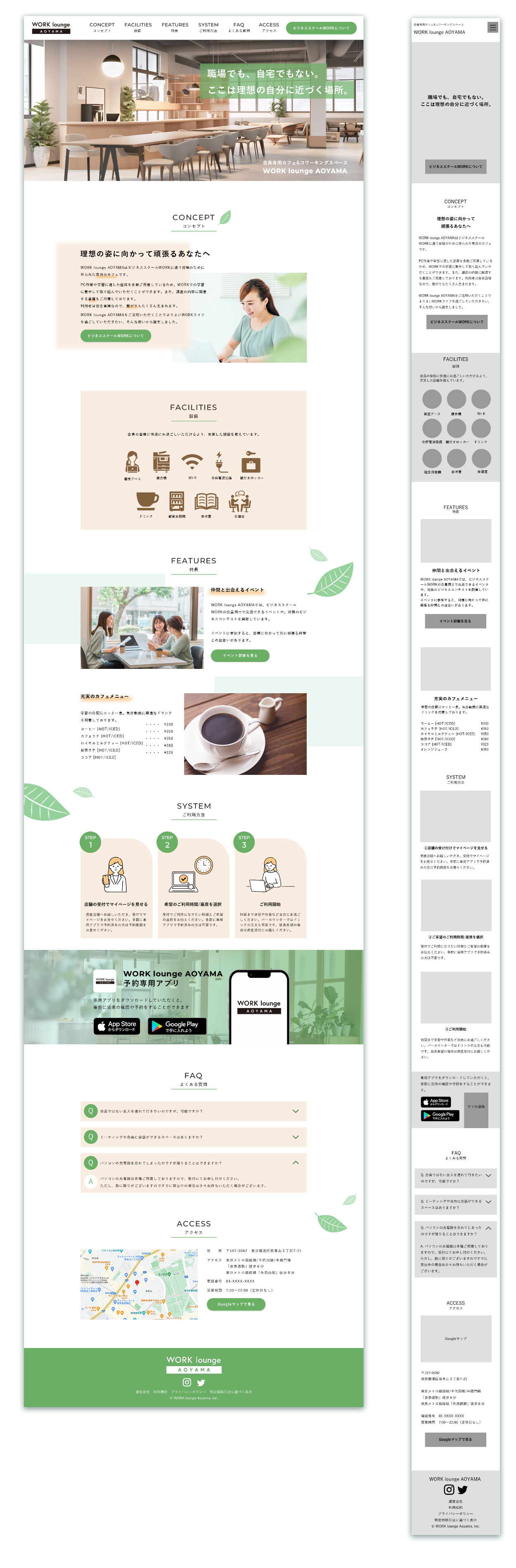 カフェのコンセプトを「自宅でも職場でもない、理想の自分に近づく場所」に設定しました。緑を多く取り入れたリフレッシュ出来る環境でありながらも、落ち着きすぎず作業が捗りそうなイメージを持たせるための工夫として、フォントはゴシック体を使用しました。また、配色は白をベース、緑をアクセントにし、すっきりとまとめました。