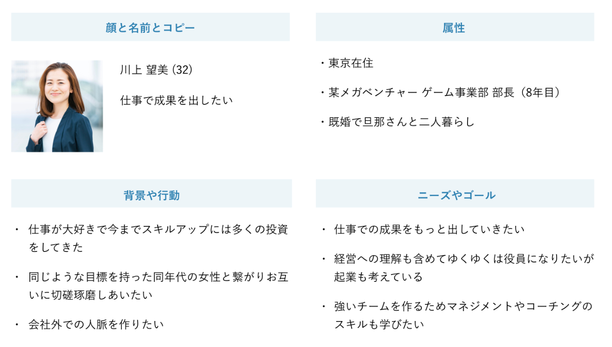 女性向けのビジネススクールを展開している。会員は20~30代の女性が多く、キャリアアップのためにビジネススキルを学び、さらにそのアウトプットの場として定期的にビジネスコンテストなどのイベントも 開催されている。