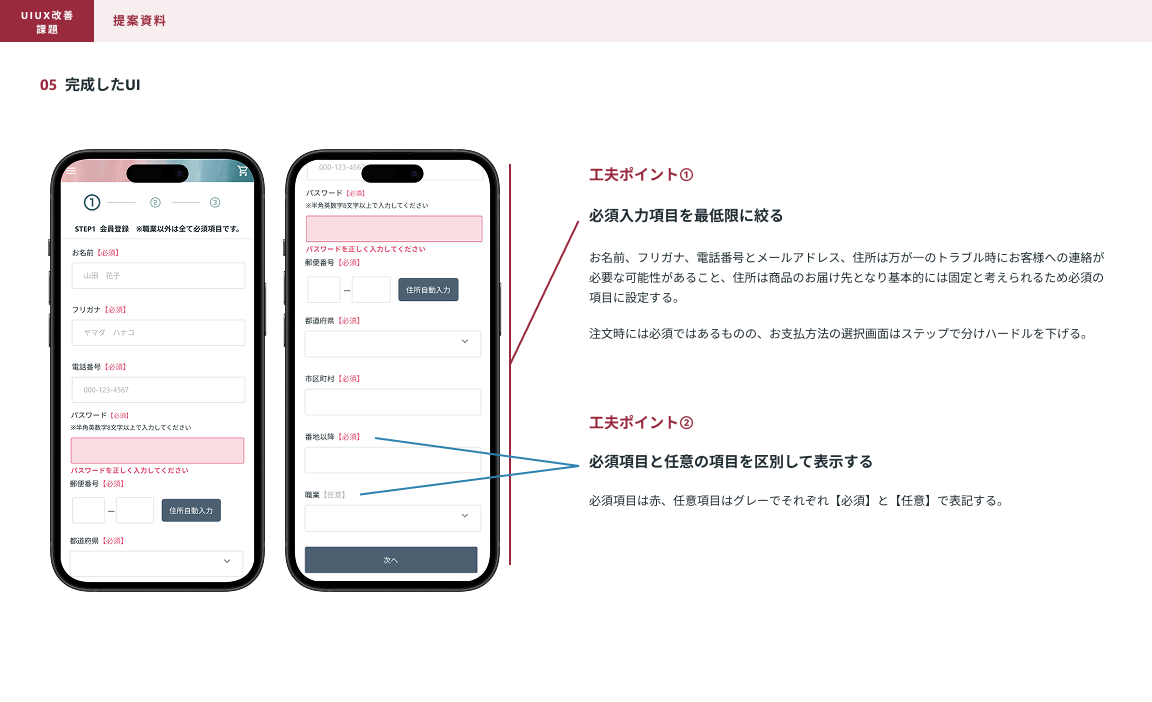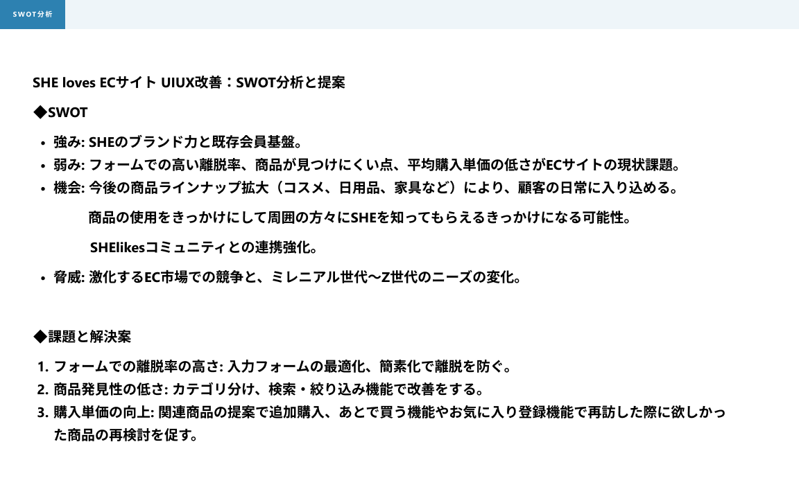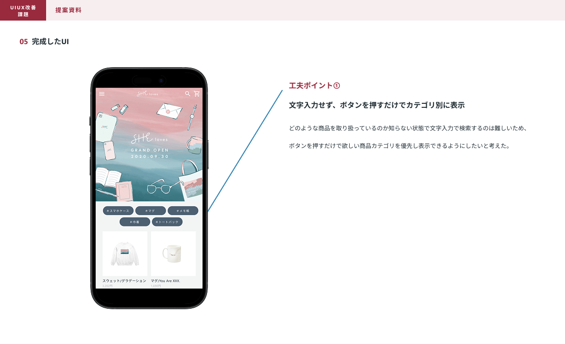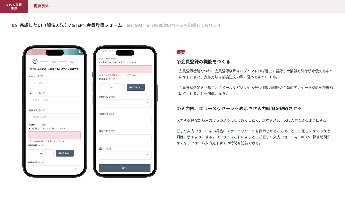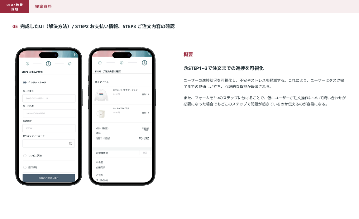 SHElikes PRO デザイナーの課題で、架空ECサイトのUI/UX改善提案課題に取り組みました。 現状分析と発生要因と解決するための要件を考え、モックアップを作成まで行いUIの改善提案資料の作成まで行いました。 使用ツール:figma 制作期間:2週間