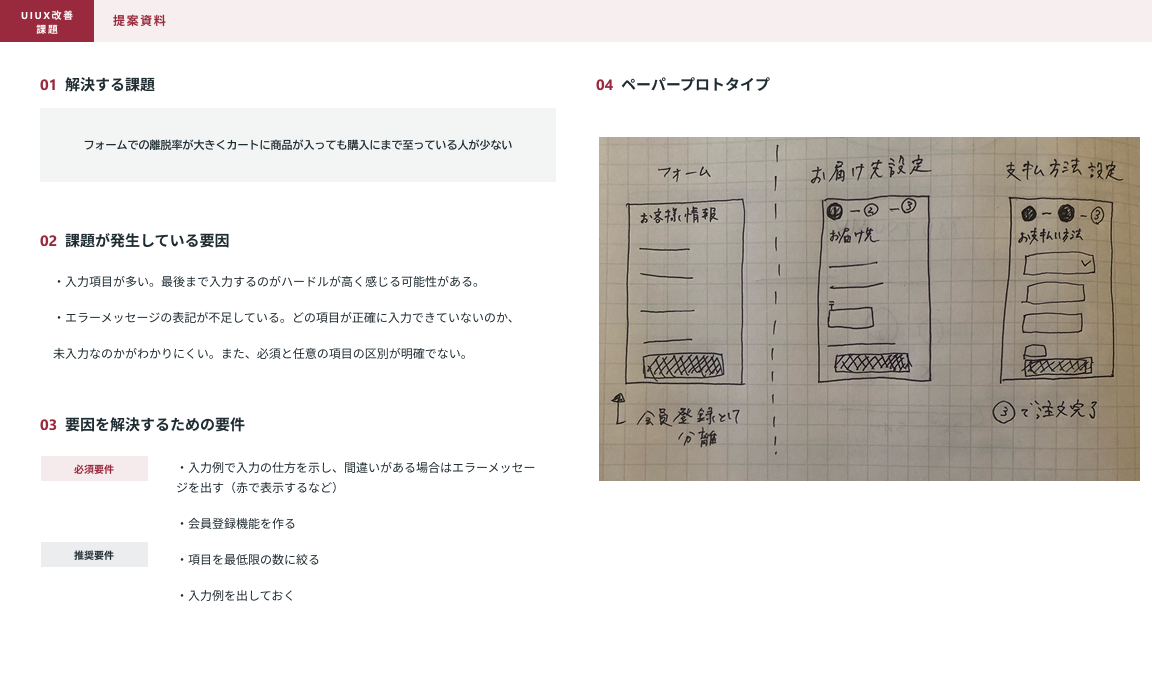 「フォームでの離脱率が大きくカートに商品が入っても購入にまで至っている人が少ない 」「ほしい商品が見つけづらく、商品をカゴに入れずに離脱している人が多い 」という2つの課題について取り組みました。