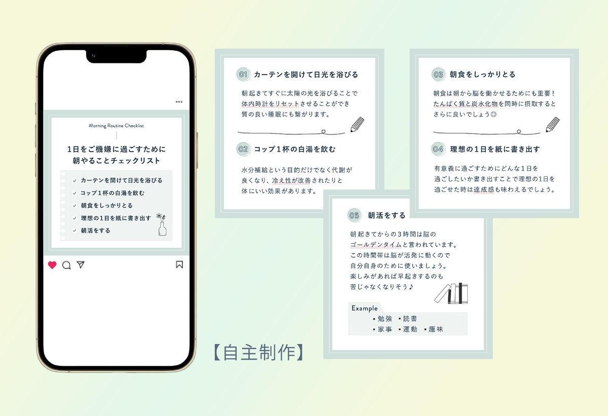 【自主制作】Instagram 投稿バナー YURI.A Designer OVERVIEW キャリアスクール SHElikesにて、出題されたお題に沿ってバナー制作を行いました。 YEAR 2024 【掲載場所・テーマ】Instagramに投稿する画像一日をご機嫌に生きるためにやることリスト【ターゲット】20-30代の働く女性仕事もプライベートもどちらも充実させたい人【目的】メディアをより多くの人に知ってもらうため、女性に刺さるコンテンツを発信する充実した一日を過ごしてもらうためのお手伝い【デザイン面の工夫】シンプルで落ち着いたあしらいを使用し、統一感のあるデザインにしました。1ページ目のチェックリストは自身で作成しました。【制作バナー】4枚