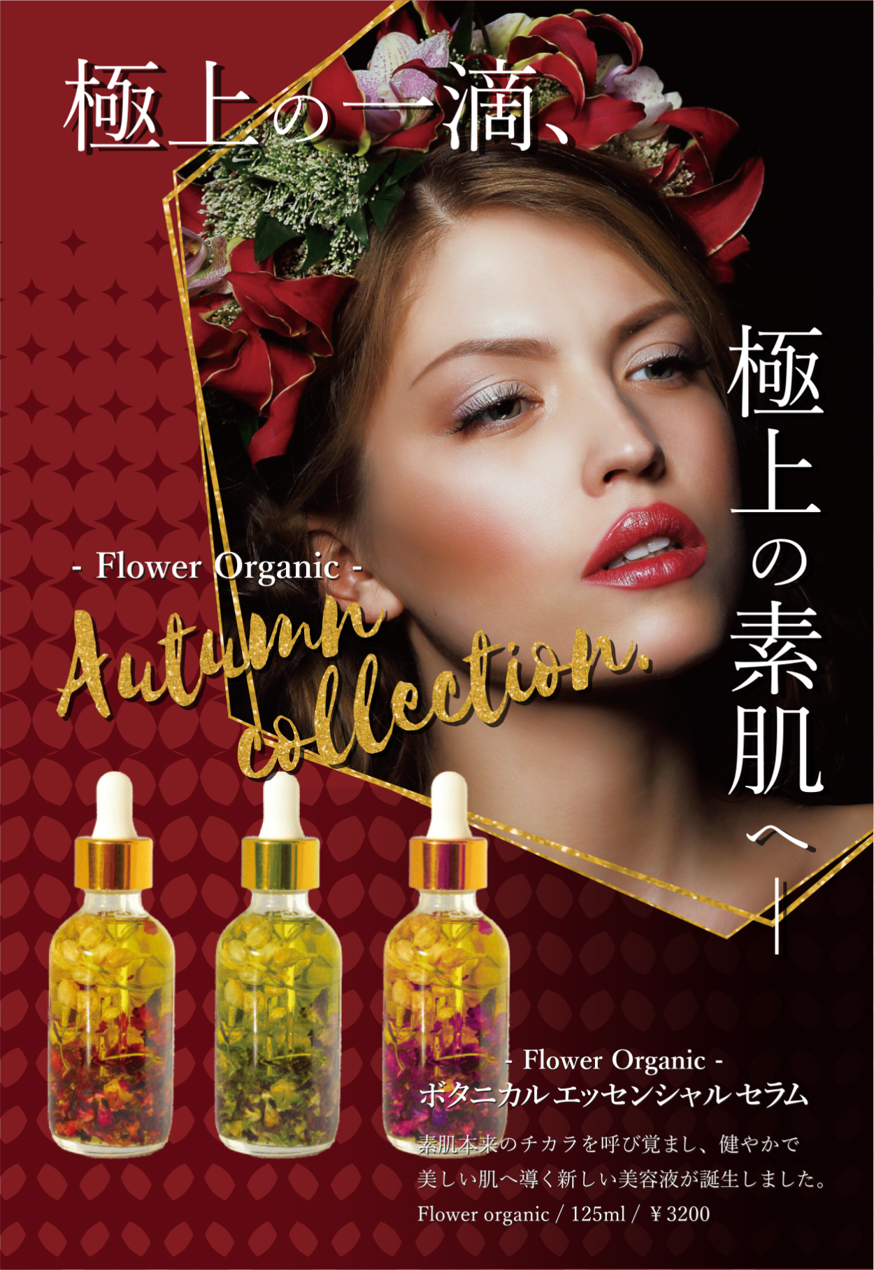 コンセプト:架空の化粧品メーカー『Flower Organic』の秋の新作発表のDMをイメージして制作しました。秋なのでワインレッドをメインカラーとし、ゴールドのテクスチャと明朝体のフォントで高級感を出しました。