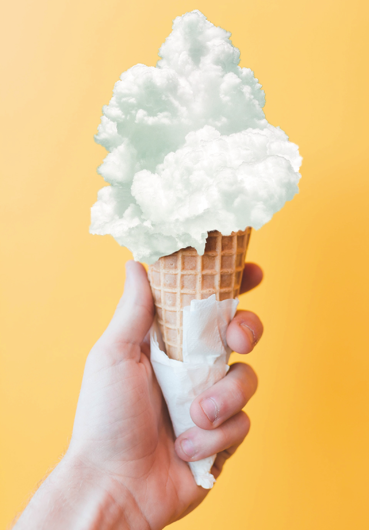 コンセプト:ジェラートと雲って似てるな。そう感じたことがきっかけで雲をアイスに見立てて仕上げてみました。そのままだと違和感があったため、少し加工して絵のような風合いにして馴染ませました。
