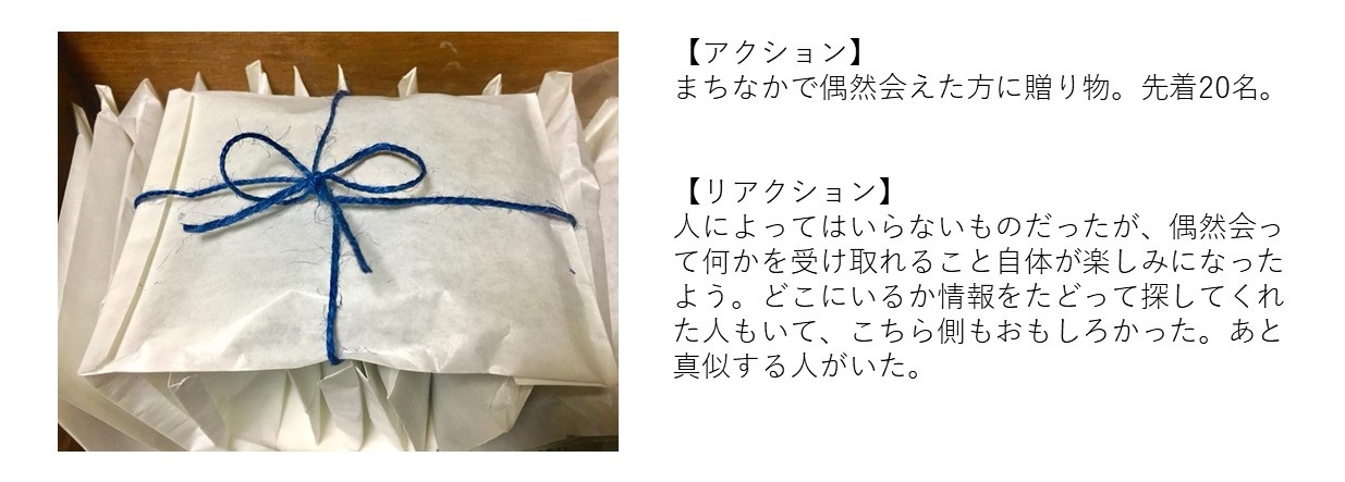 コミュニケーションは、GIVEから始まるのではないか。私から発生したGIVEは、そこからどんな展開が起こるだろうか。くだらない事やっている人が街にいるって、おもしろいんじゃない。