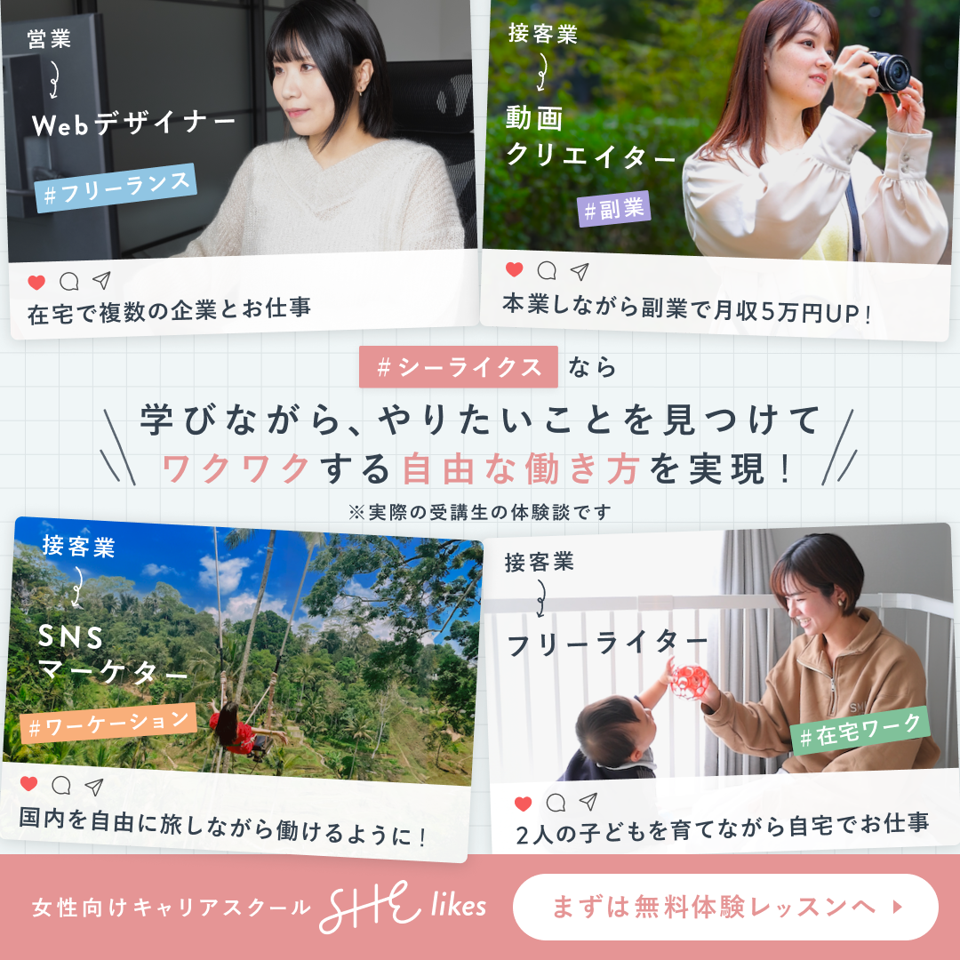 SHE株式会社様が運営する女性向けキャリアスクール「SHElikes」体験レッスンへの誘導を目的としたSNS広告バナーを制作しました。 使用ツール:Figma、Photoshop/制作時期:2024年5月