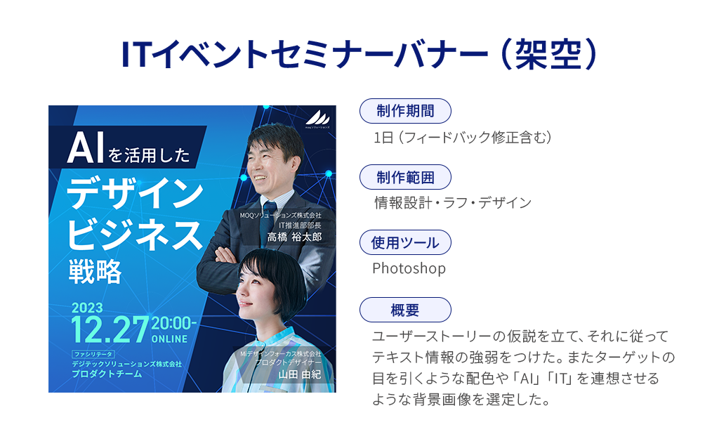 また「IT企業の社員」であるターゲットの目を引くよう、サイバー感のある先進的なイメージが湧く画像を背景に配置。タイトル周りのざぶとんはグラデーションで傾斜をつけ、斜めのラインを作り、ビジネスのセミナーであることが伝わるようにしました。