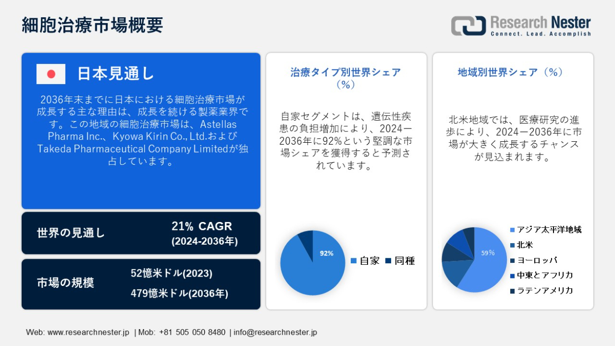 細胞療法市場:2024~2036年の動向、セグメント、規模、需要分析 Tatsuki Nakamura Market Researcher OVERVIEW 細胞治療市場調査 北米の細胞治療市場は、他のすべての地域の市場の中で、2036年末までに約59%のシェアを占めると予想されています。この地域の市場成長は、医療研究の進歩の進展によっても期待されています。米国の医療制度は、医薬品の生産と医療研究に多額の資金を投資しており、その結果、この地域の細胞治療技術が継続的に進歩する可能性があります。 WEBSITE