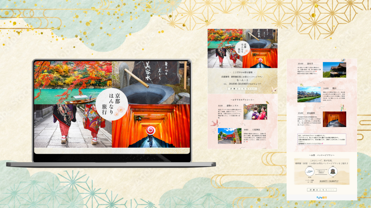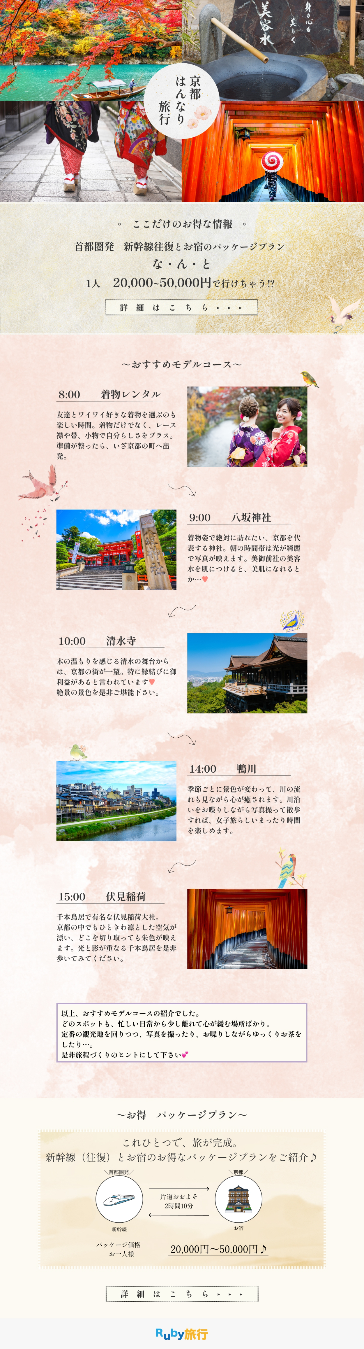 首都圏発の新幹線(往復)+お宿のパッケージプランを販売します。LPでは女性の方に楽しんでいただける京都旅行モデルコースを紹介し、パッケージプランの検索ページに誘導する流れで作成をお願いいたします。