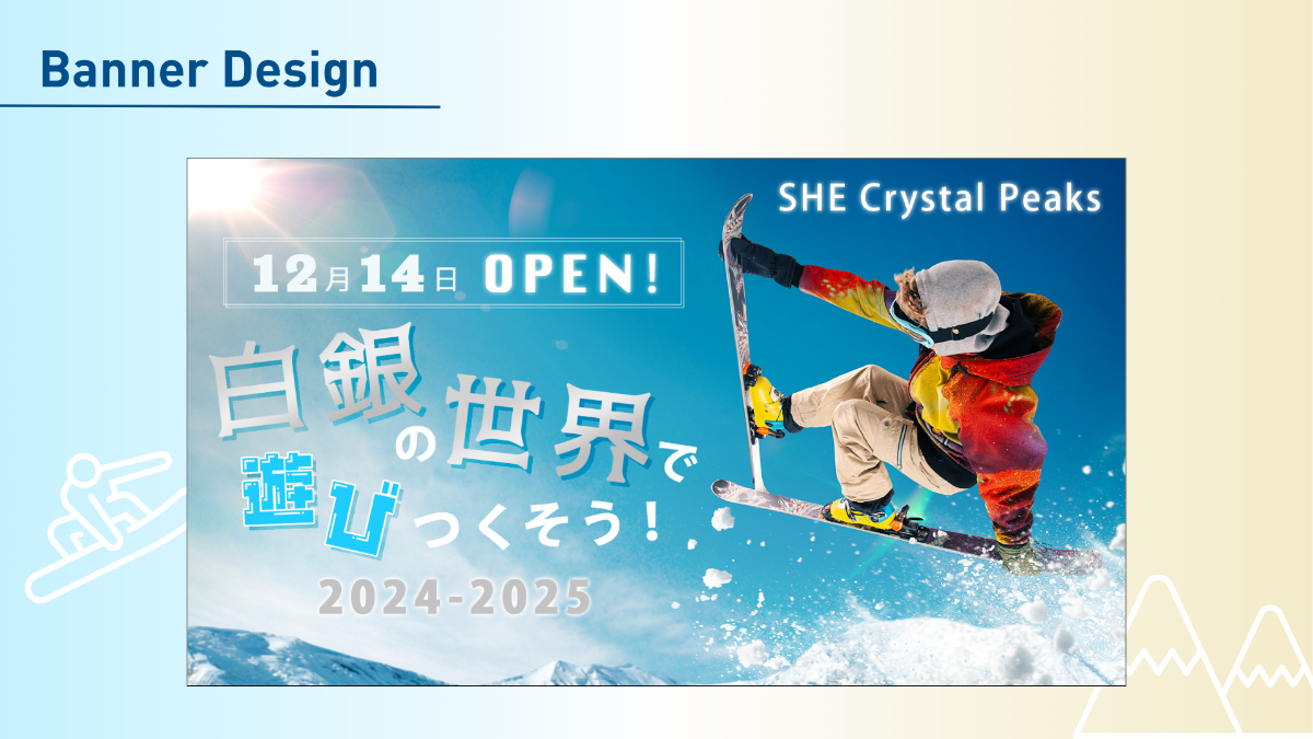 - トンマナにも爽快感とあるので、左上に太陽があり、それに向かって雪飛沫が上がるように滑っている写真の配置を工夫し、今にも滑り出しそうな雰囲気を演出しました。