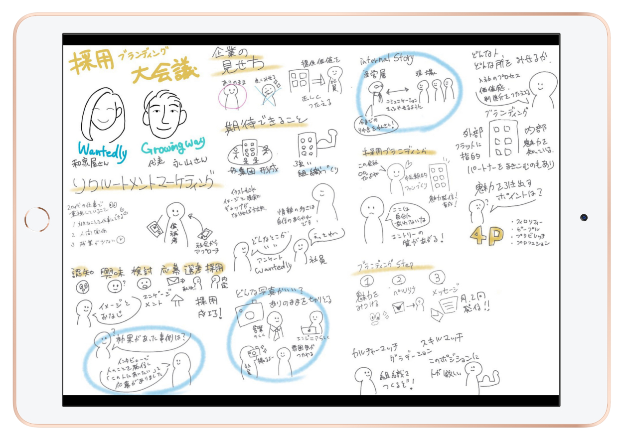 株式会社GrowingWayで主催したイベントのグラフィックレコードです。 事前に登壇者の似顔絵のみ書いておき、内容はイベント中に記入しました。 【所要時間】1時間(イベント内に完成) 【制作ツール】ibisPaint X (iPad)