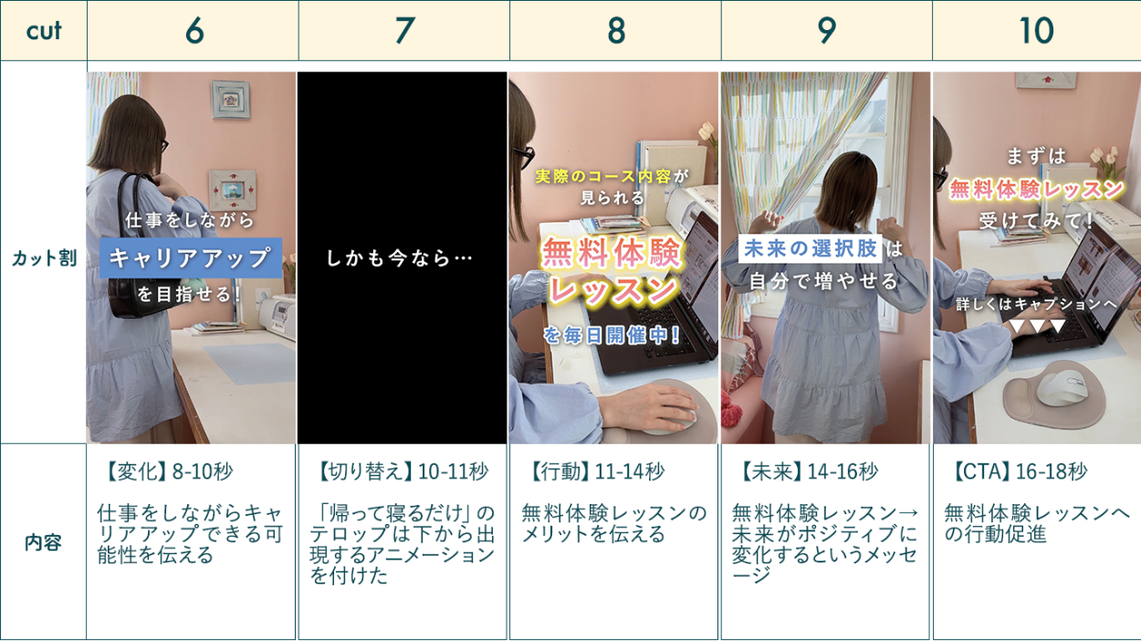・離脱を防ぐため全体的にアップテンポな動画となるよう、2秒前後でカットが切り替わるようにし、SEやテロップアニメーションを各カットに用いることで飽きのこない動画になるよう制作しました。