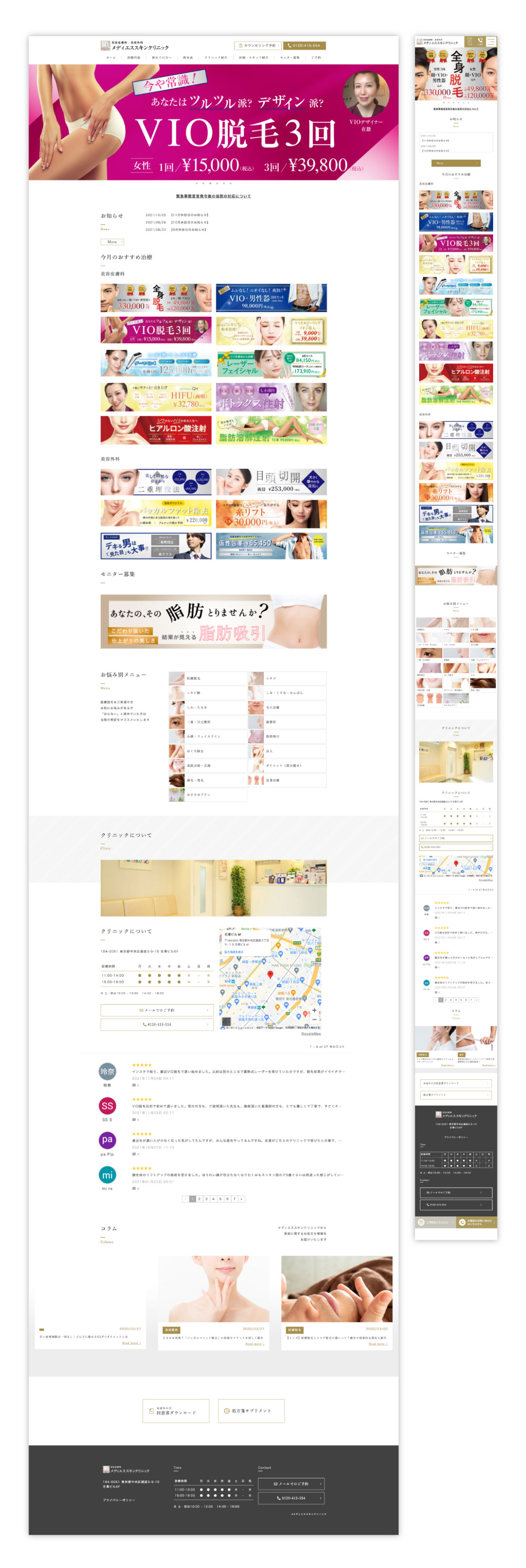 クリニックのサイトを制作するにあたり自身で1番大事としている”清潔感””安心感”、また美容医療ならではの”ゴージャス感”をカラーで表現しております。