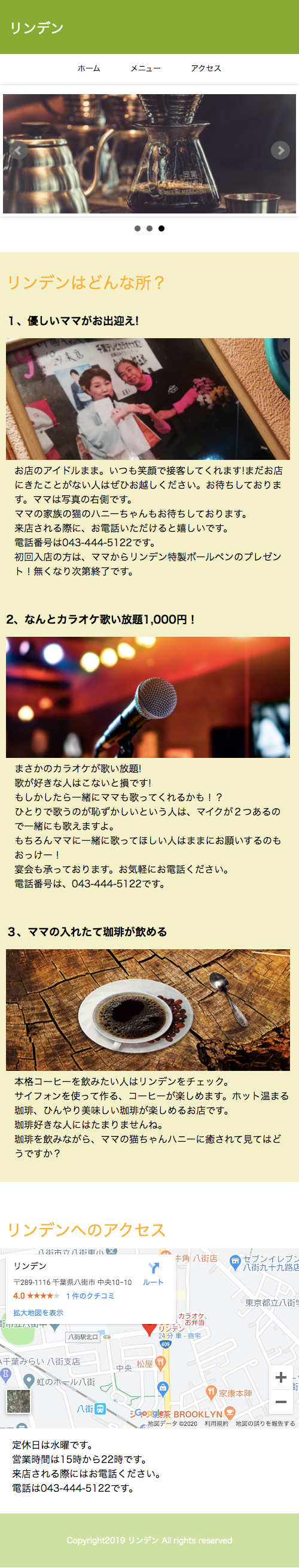 今風ではありませんが、トップの右端に、電話番号と住所を入れたのは、カフェサイトを見てくれるだろう年齢層が高いためすぐに場所と電話番号が確認できるように故意に一番上に書きました。