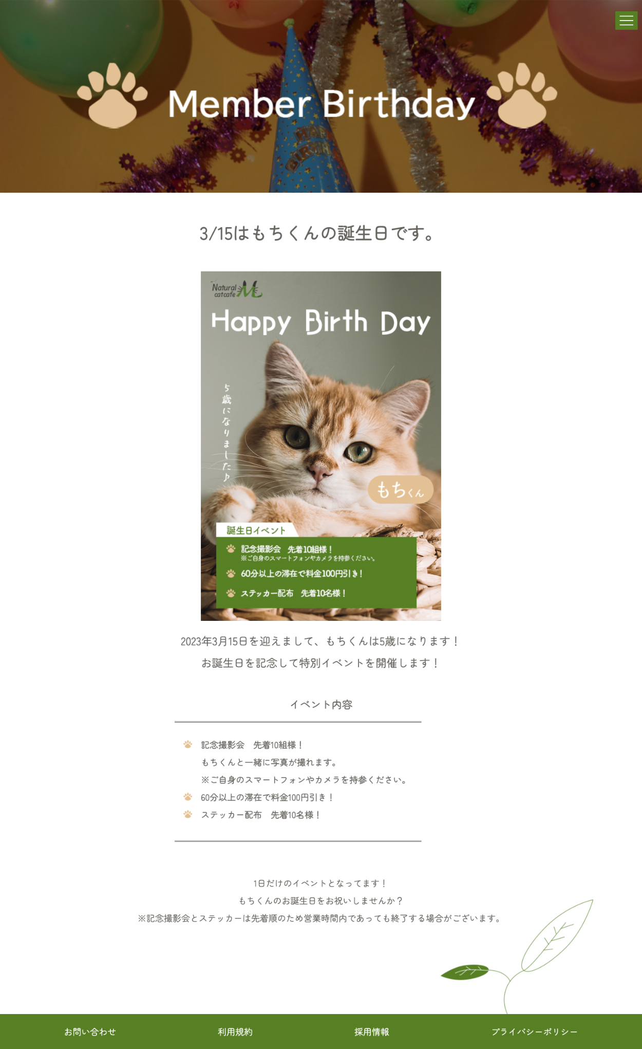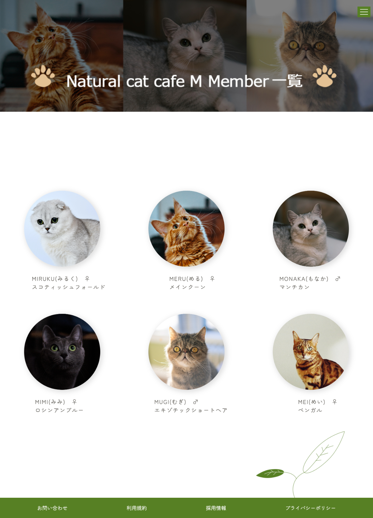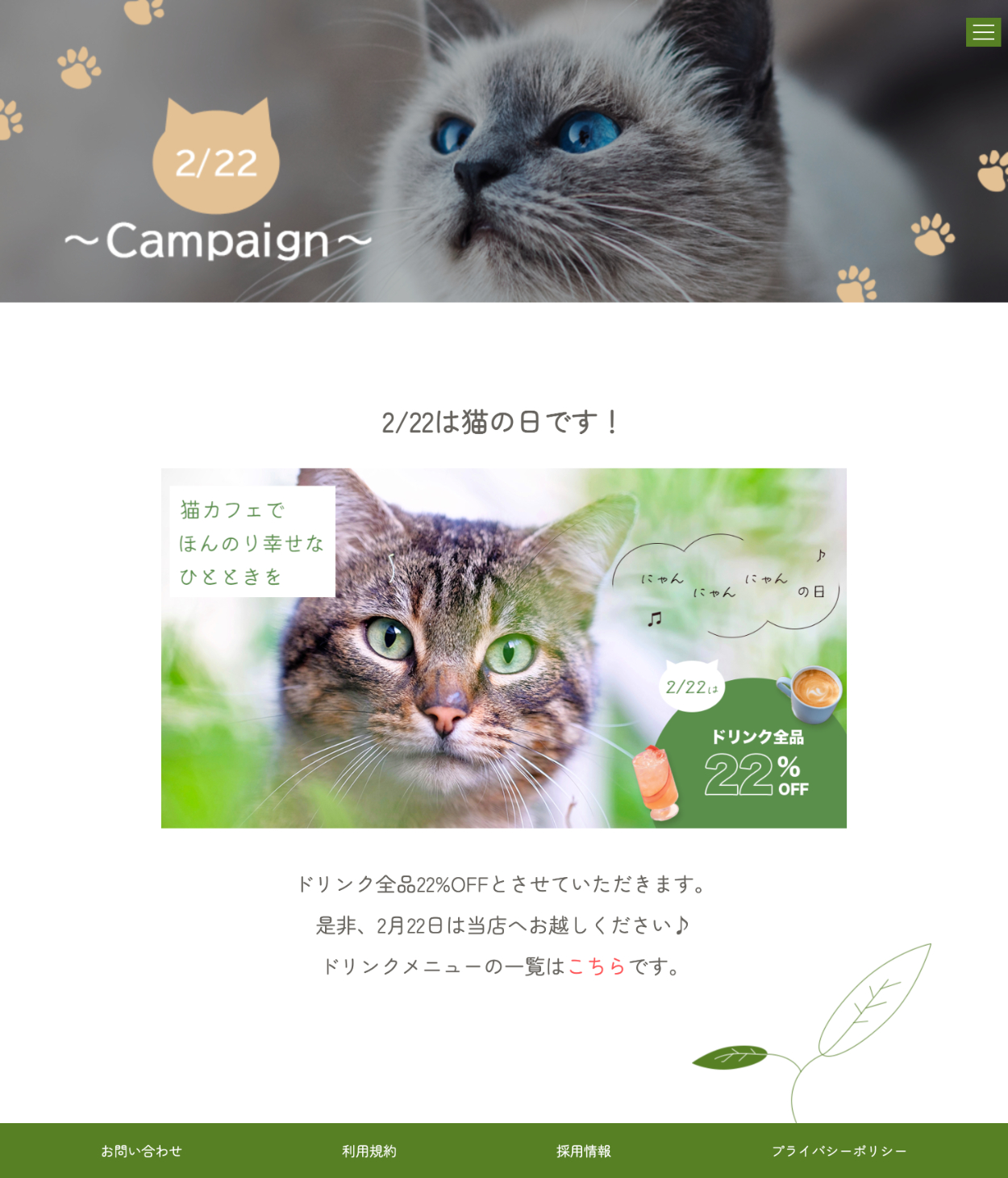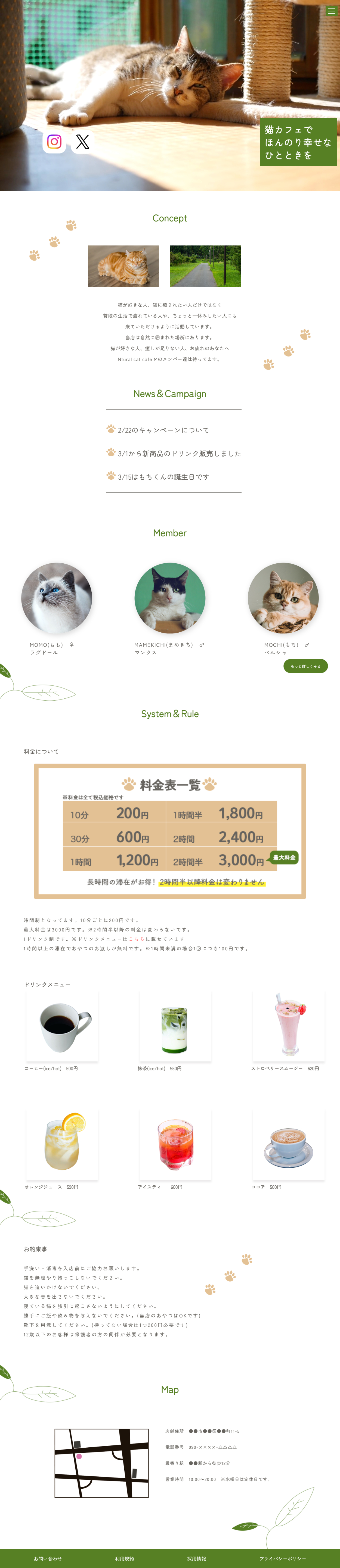 自然に囲まれた猫カフェをコンセプトにしているため、緑色をメインに配色しました。