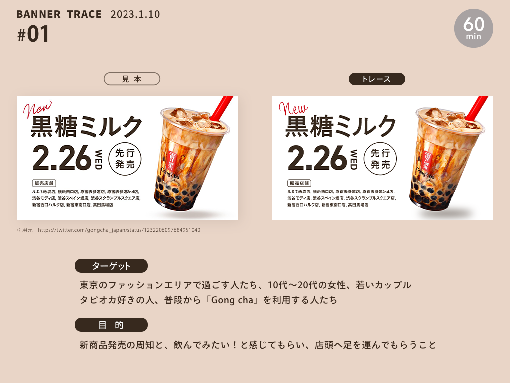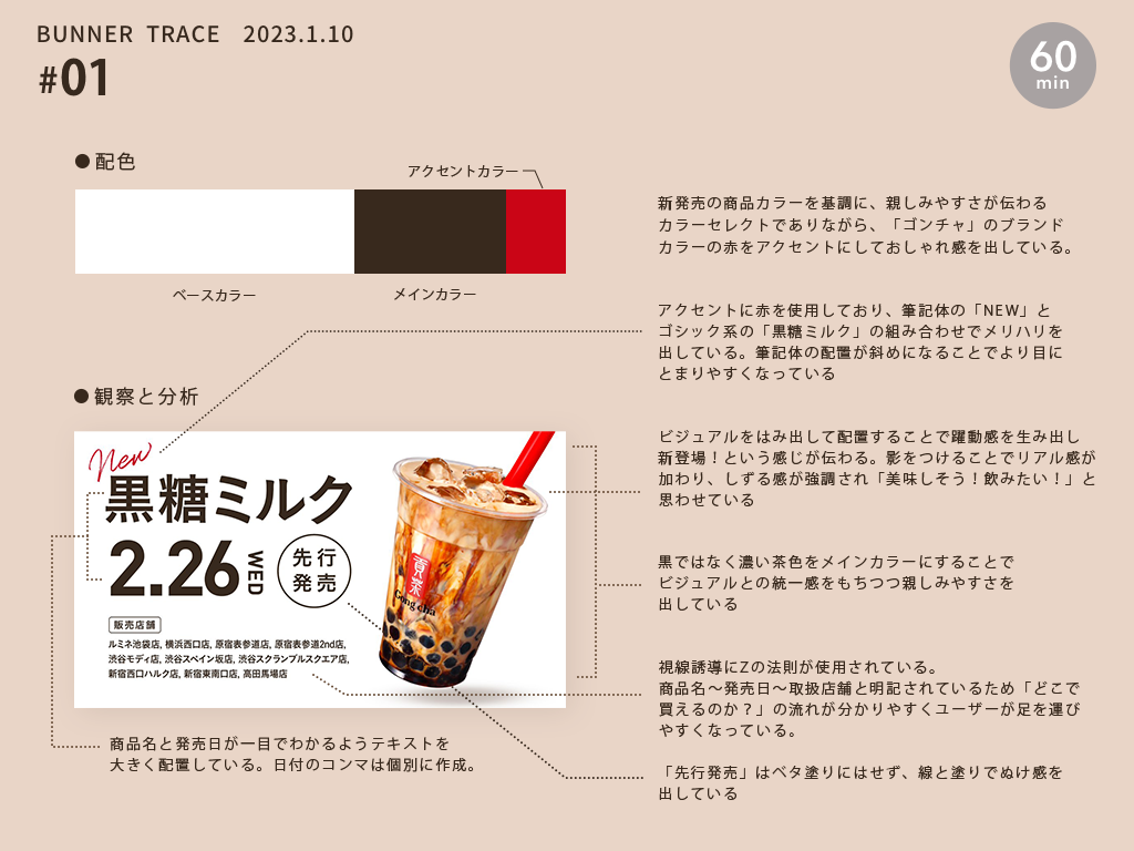 1)新発売の商品カラーを基調に、親しみやすさが伝わるカラーセレクトでありながら、「ゴンチャ」のブランドカラーの赤をアクセントにしておしゃれ感を演出している。