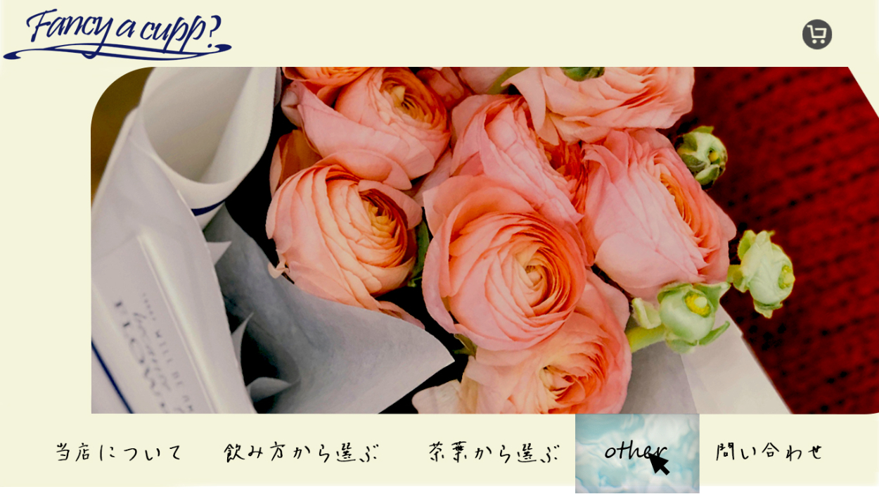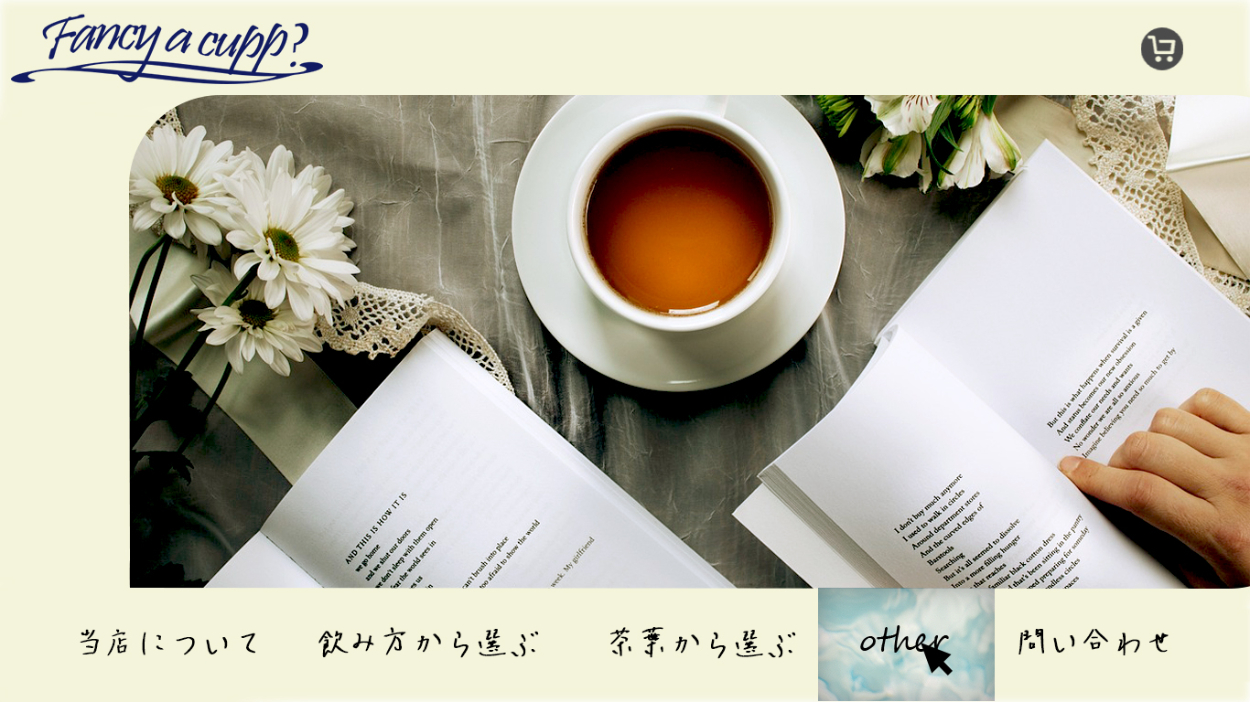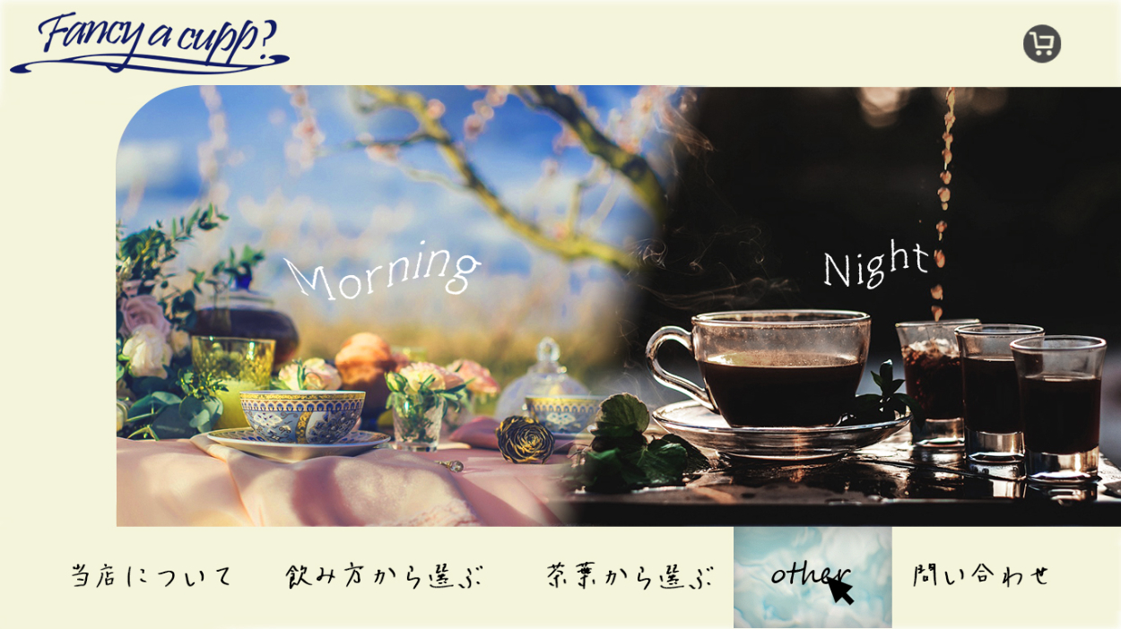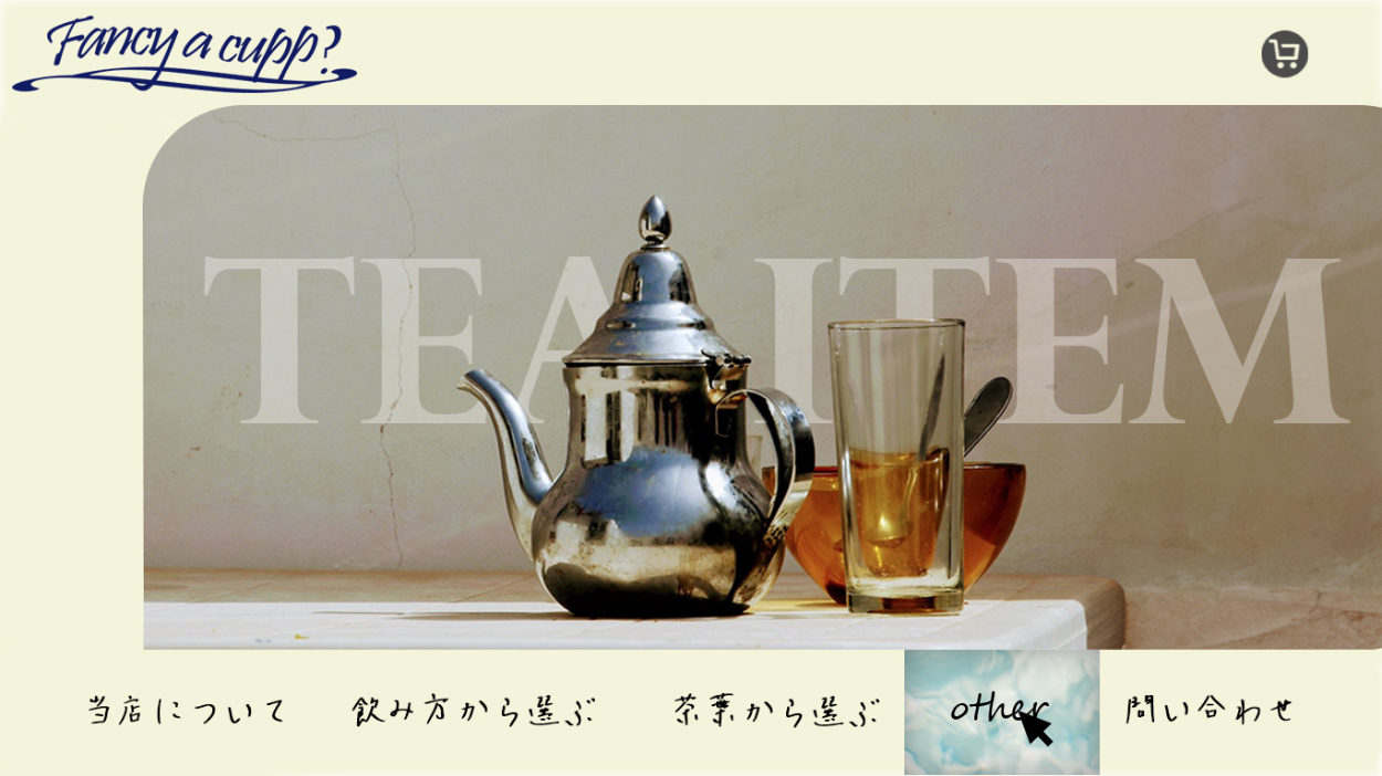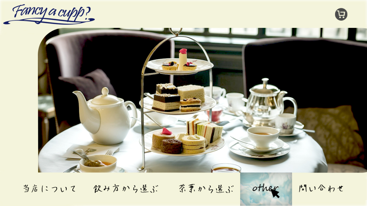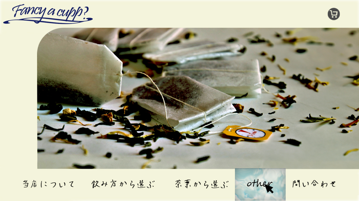 架空の紅茶の専門店「fancy a cup?」のデザインカンプを作成しました。 ページによって切り替わるファーストビューの部分のデザインです。