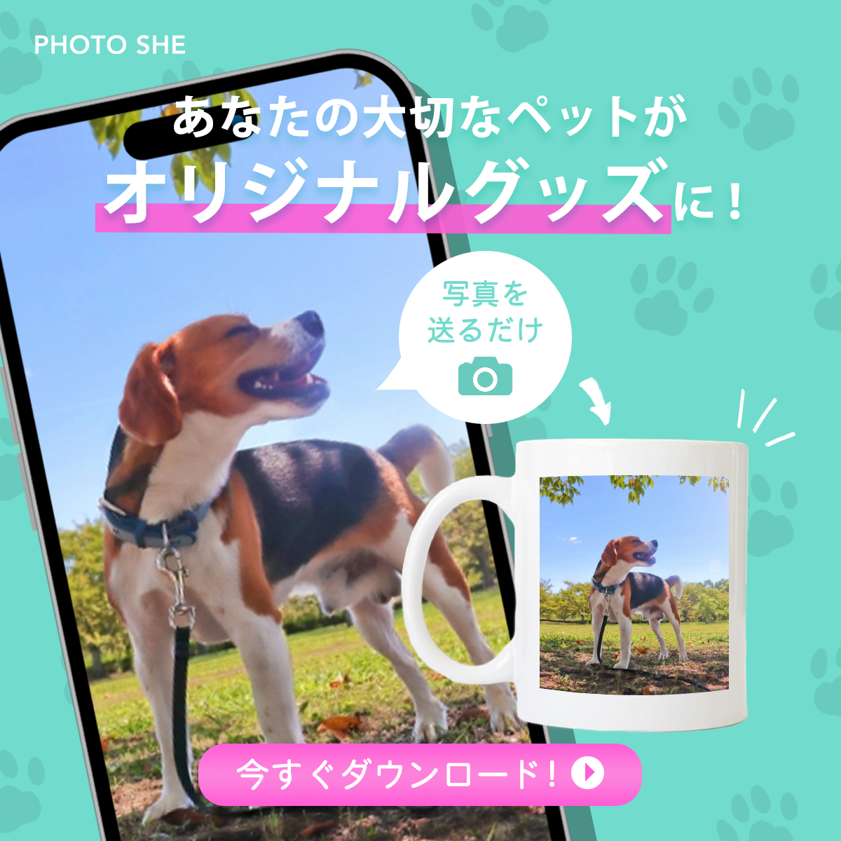 - 背景にペットの足跡を入れ、可愛らしさを出しました。