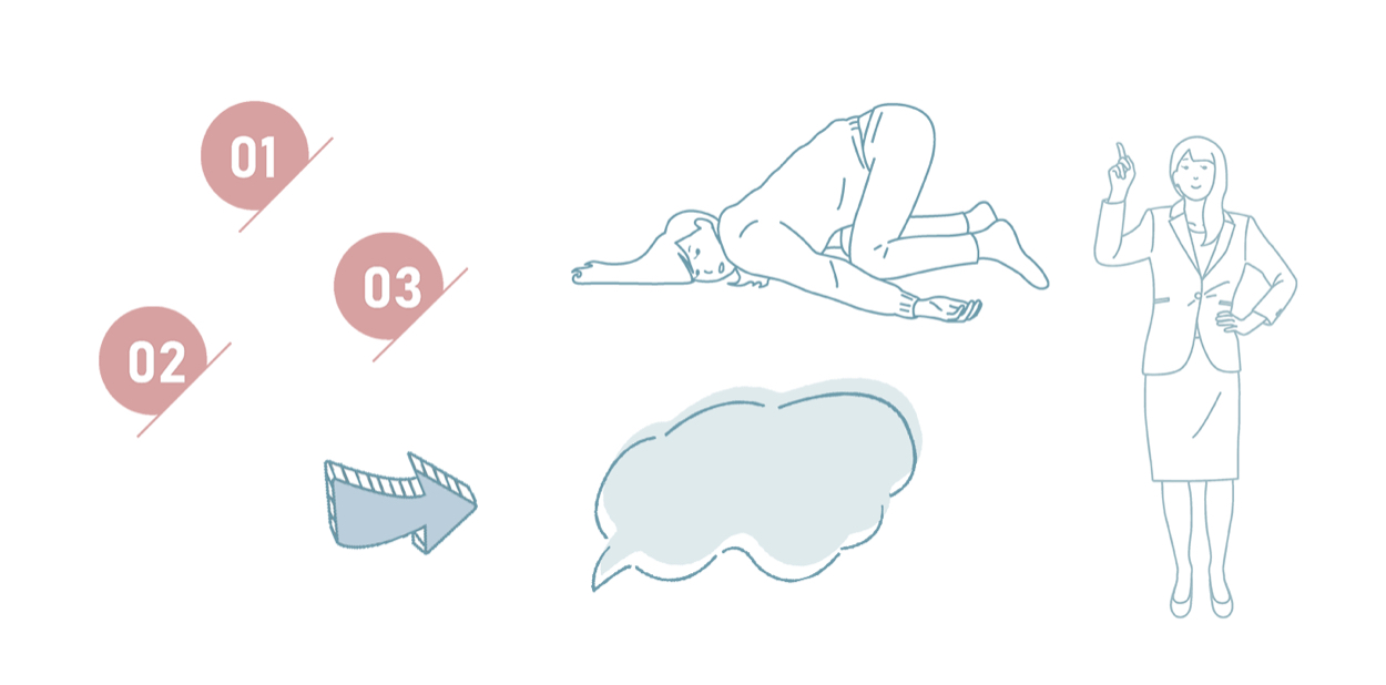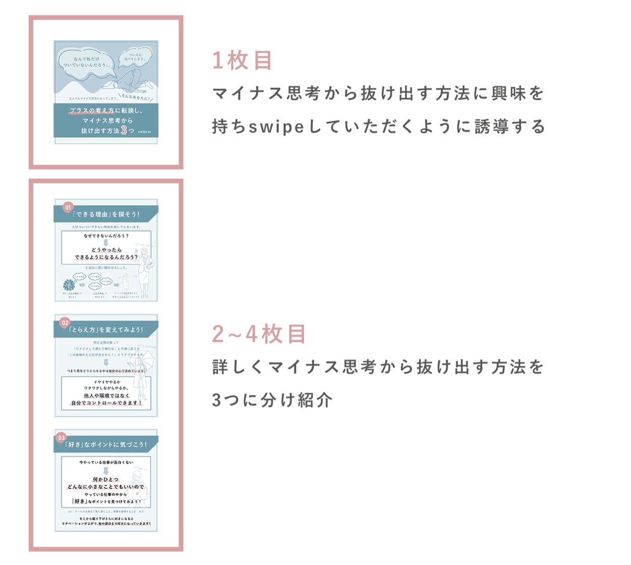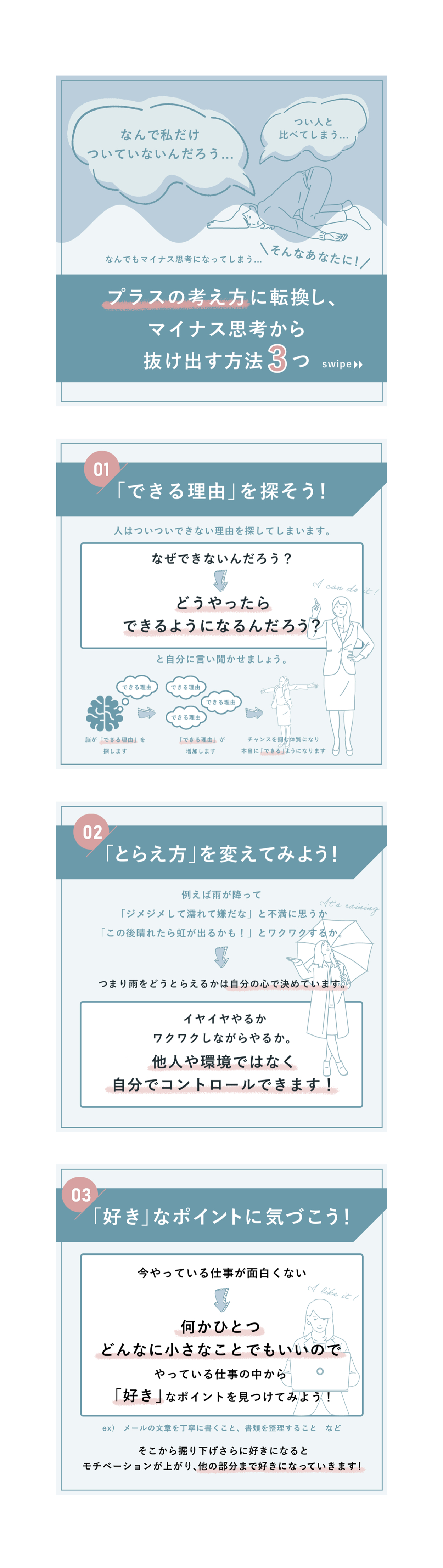 1枚目でマイナス思考から抜け出す方法に興味を持ちswipeしていただくように誘導すし、2~4枚目で詳しくマイナス思考から抜け出す方法を3つに分け紹介しました。全体的に大見出し、お伝えしたいこと、説明の順に構成にし、パッとみて理解しやすいようにしました。