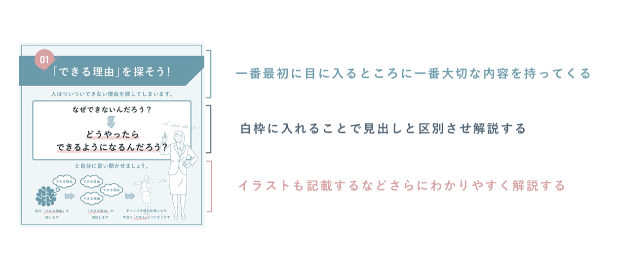 - シンプルなデザインになりやすいのですが、数字の見出しを丸が欠けたデザインになっているので枠も右下が欠けたデザインだったり矢印やマーカーの部分が手描き風のタッチになっていたり、「絵的なおもしろさ」が出せると文字が並んでるという印象が和らいで素敵なデザインになるということがわかりました。