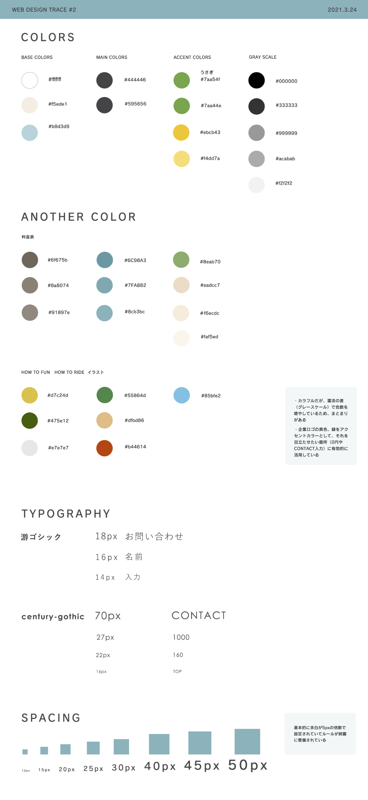 今回ですと、余白には5の倍数で設定されていました。また、日本語フォントについては2の倍数で設定されていました。規則性があることでサイト全体にまとまりが出ます。さらに、各セクションごとのタイトルのフォントサイズなど同じサイズに繰り返されることにより、視覚的にも分かりやすいことに気づきました。